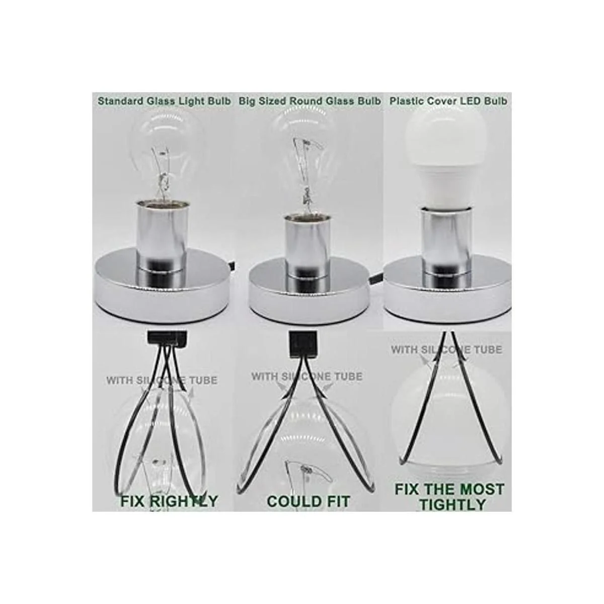 Clip de bombilla con niveladores de pantalla. Envuelto con tubos de silicona resistentes al calor que añaden fricción para agarrar la bombilla. Se ajusta cómodamente y mantiene la pantalla de la lámpara firmemente en su lugar. El material de silicona puede soportar una bombilla caliente y no se derrite