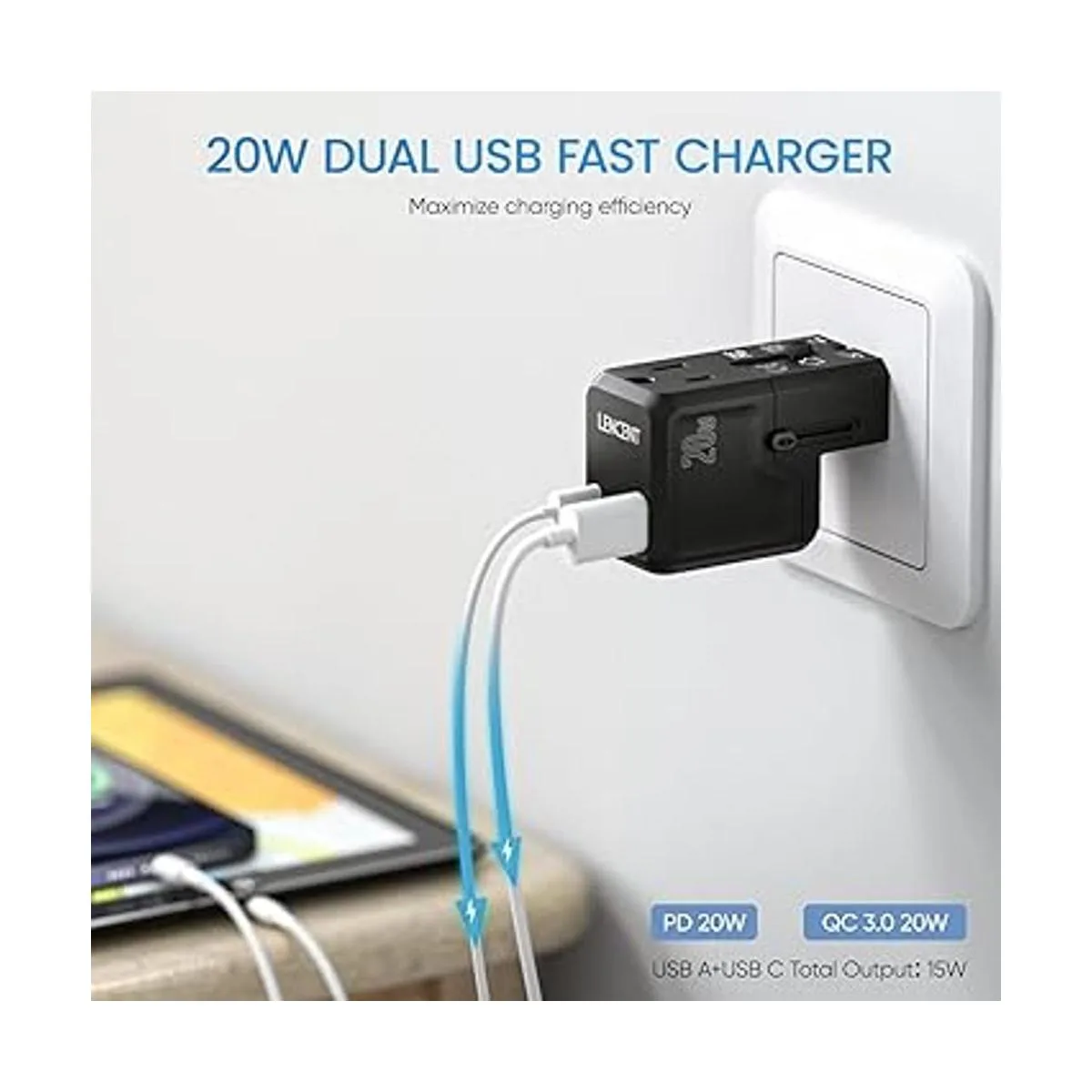 Cargador rápido de doble puerto de 20 W: el adaptador de viaje LENCENT está equipado con dos puertos de carga rápida de 20 W, puerto USBC y USBA para satisfacer tus diferentes necesidades. Puede cargar el iPhone 13 hasta un 50 en 30 minutos, más hasta 4 veces más rápido que con un cargador original de 5 W. Ideal para cargar laptop, teléfonos, auriculares Bluetooth, cámara, interruptor, etc. La salida total de USBA y USBC es de 15 W máx.