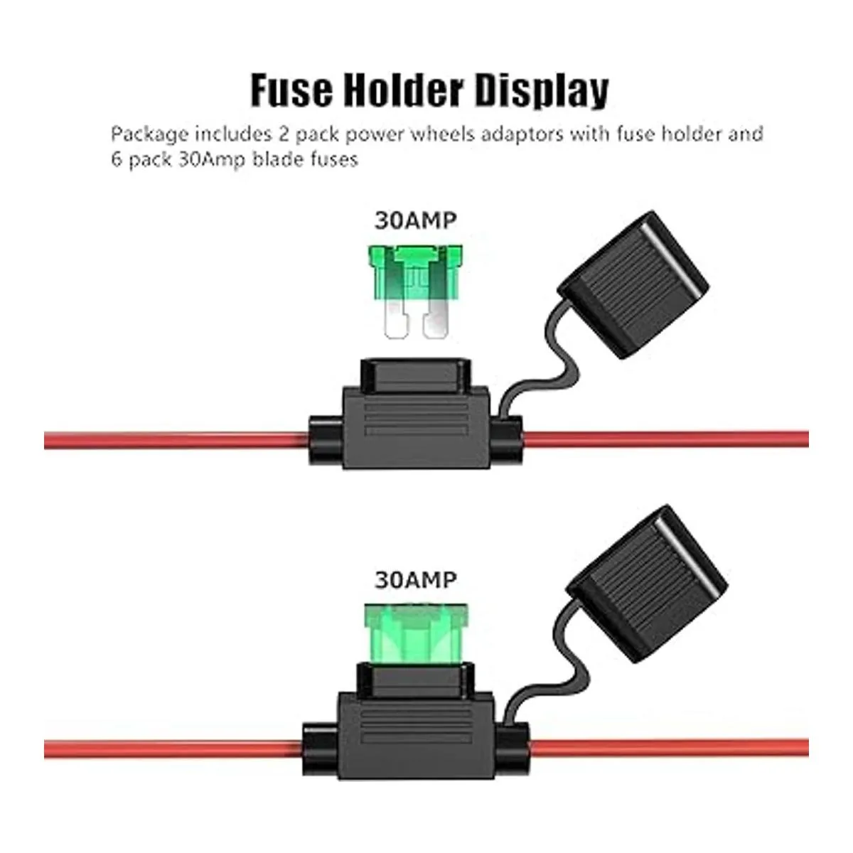 El paquete incluye 2 adaptadores de ruedas eléctricas con soporte para fusibles y 6 fusibles de cuchilla de 30 amperios. Te permite siempre tener piezas de repuesto para un fácil reemplazo más tarde. Nota: El cable rojo está conectado al terminal positivo y el cable negro está conectado al negativo. Al utilizar, los dos cables no deben estar en contacto. Si el adaptador de rueda eléctrica no se utiliza durante mucho tiempo, separarlo de la batería.