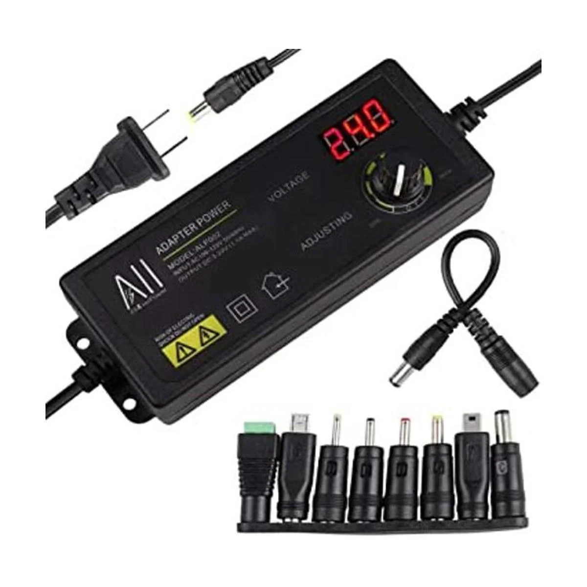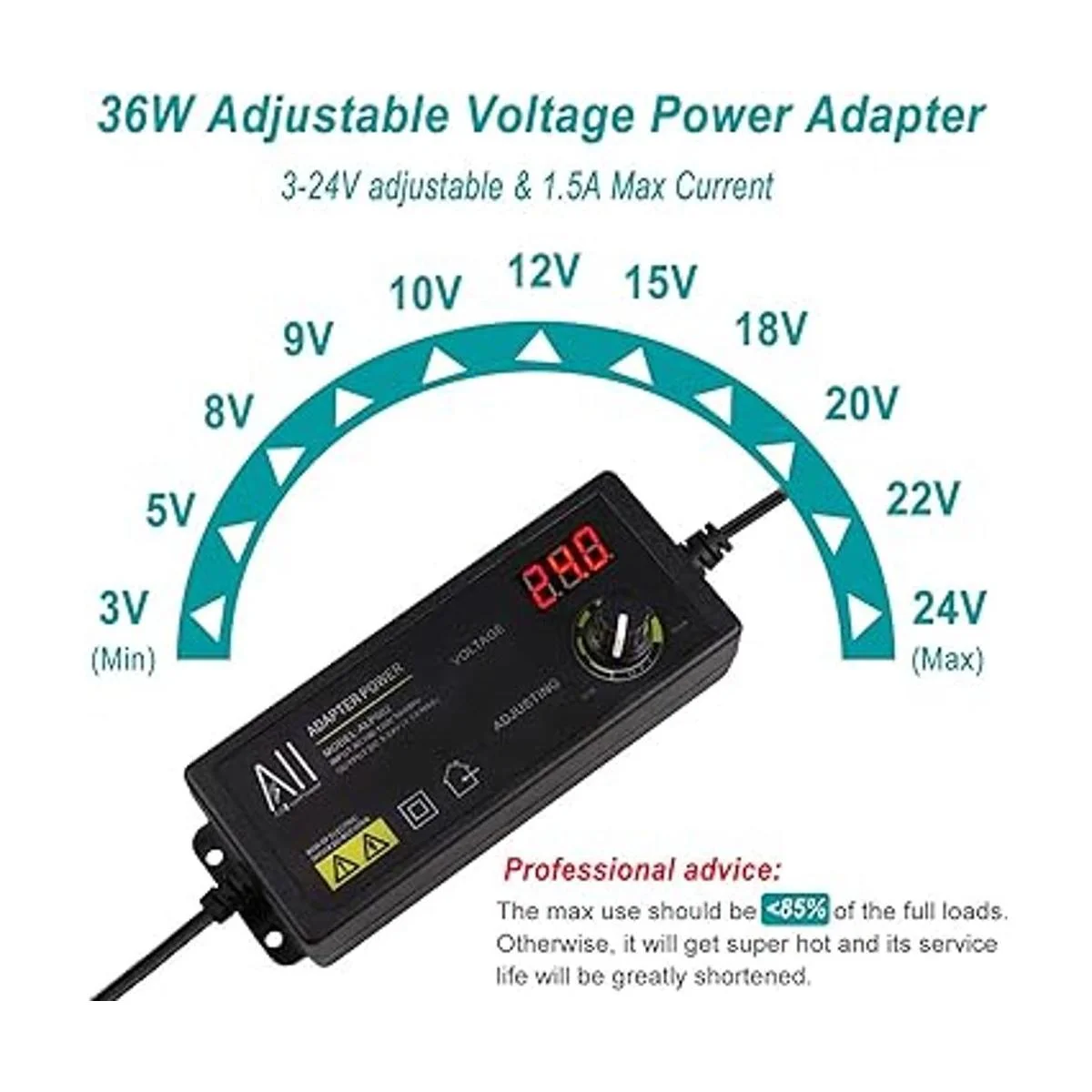 Adaptador universal de 3 V 24 V 1.5 A 36 W ajustable de fuente de alimentación CC, control de velocidad, pantalla de voltios con 8 enchufes variables y 1 cable de polaridad inversa