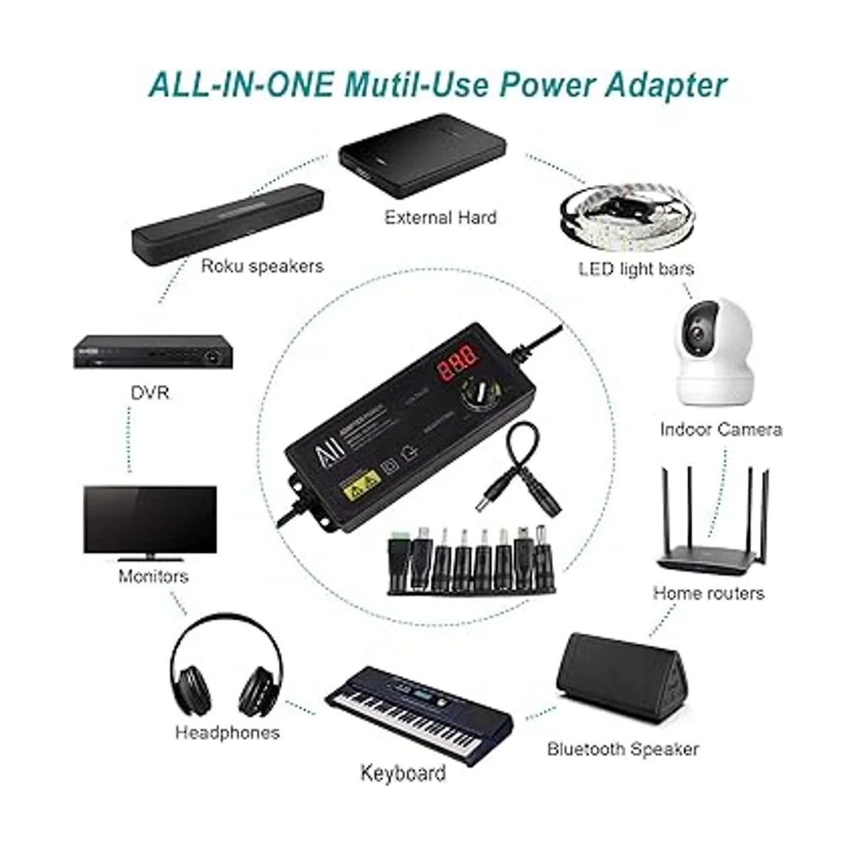 Adaptador todo en uno: se adapta al 90 de los electrodomésticos CA/CC. Nota: No funciona en la computadora. . como tiras LED, luz debajo del gabinete, caja de TV, altavoces inteligentes, routers inalámbricos, humidificador difusor de aceite esencial, ventilador USB, cámara Wifi, hub USB, caja de disco duro, motor CC, bomba CC, marco de fotos digital, sistema de vigilancia DVR NVR, etc.