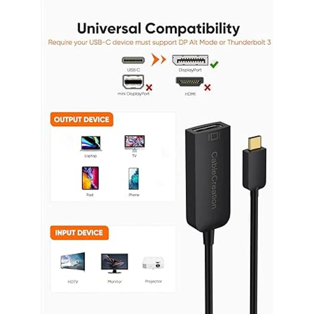 Amplia compatibilidad: este adaptador USB C a DP es compatible con MacBook Pro / MacBook Air 2020 2019 2018, iMac mediados de 2017 y posteriores, Mac Mini 2018, iPad Pro M1 2021/2020/2018, XPS 15/13/12, EliteBook Folio G1/Spectre 13, Thinkpad E580/ T470/ T480/ X1 Carbon 2017, Pixel 2015/ Pixelbook, Surface Book 2/ Surface Go/Surface Pro 7, Galaxy Tab S4/ S5e/S6, Galaxy S22/S22 Ultra/S20/ S20/ S20 Ultra/ S8/S9/S10/S10/S10/Nota 9/Nota 8