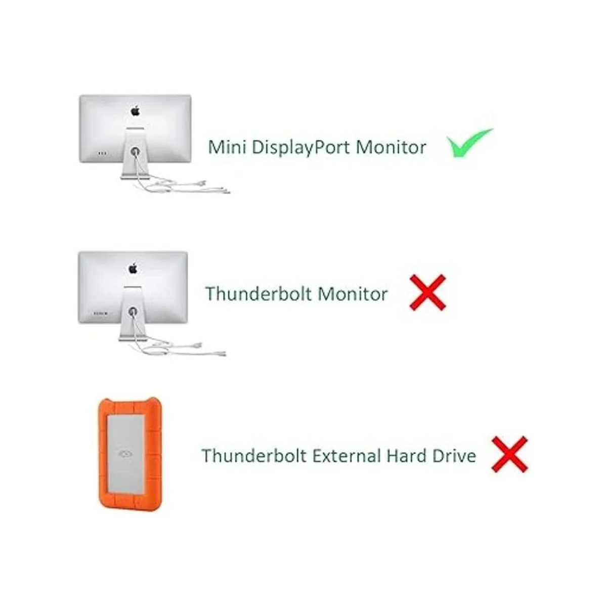 Consejos: el Mini DisplayPort es bastante diferente de Thunderbolt. Este adaptador no es compatible con Apple Thunderbolt Display 27 pulgadas. No es compatible con discos duros Thunderbolt, pantallas, cables, conectores. Además, no se puede utilizar con Cable Mini DP a HDMI o Mini DP a DVI.