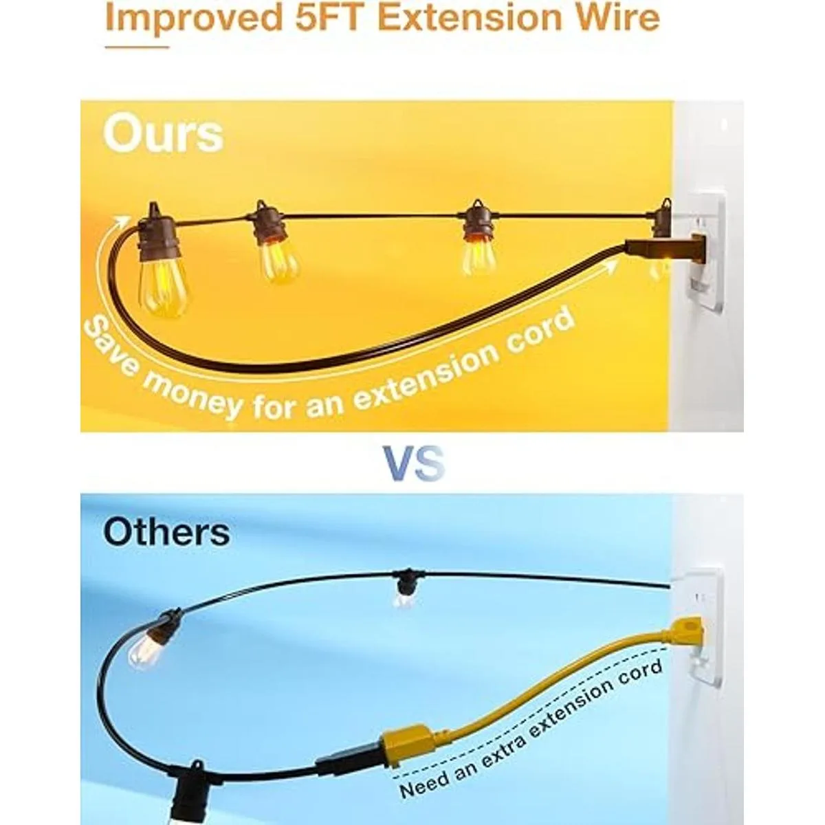 Cable de repuesto: la luz está diseñada con un espacio más grande aproximadamente 5 pies desde el enchufe hasta el primer enchufe, lo que tiene como objetivo guardar el cable de extensión. Esta pieza es conveniente para colgar las luces, no necesitas comprar un cable de extensión adicional y enchufar.