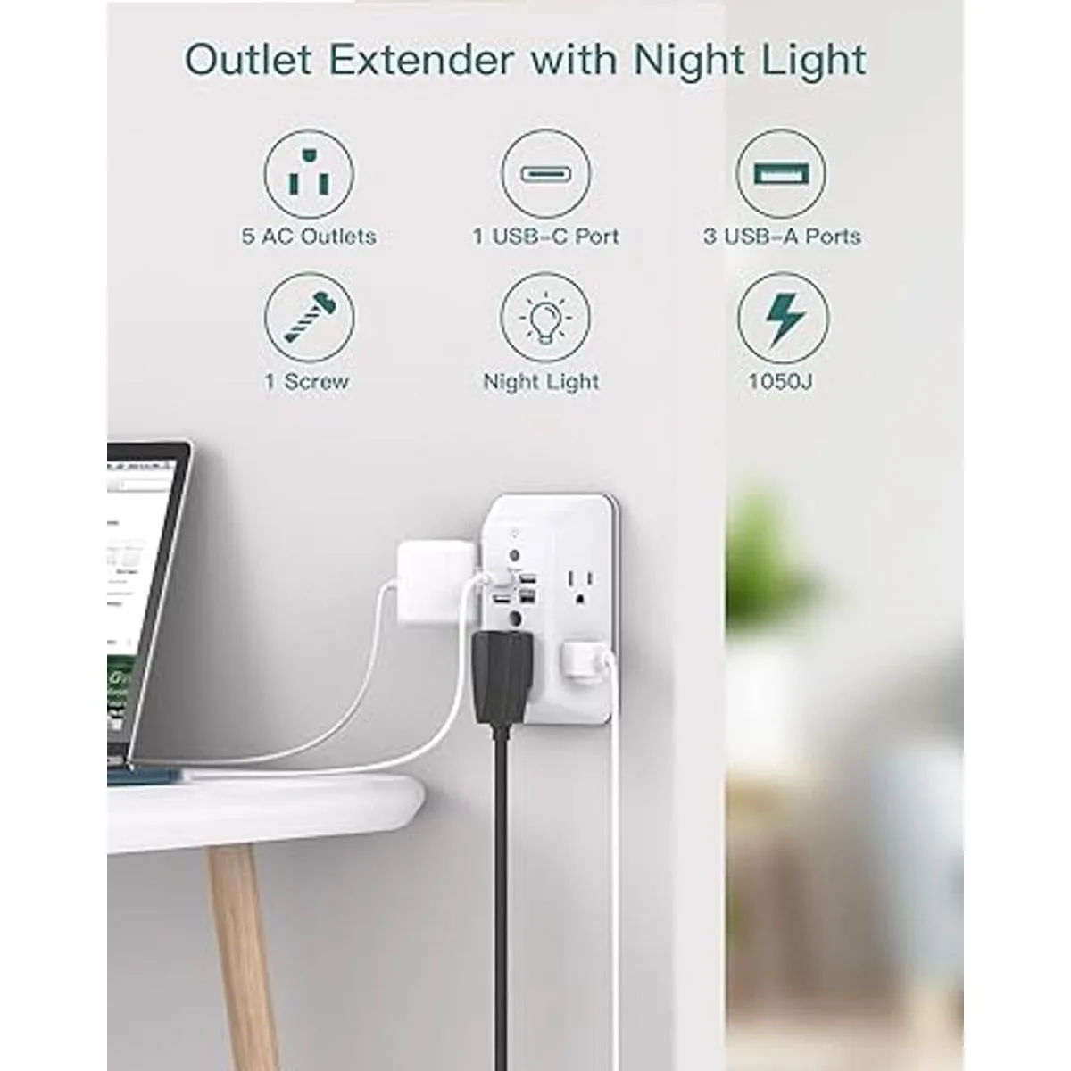 Addtam Protector de sobretensión, extensor de salida con luz nocturna, divisor de 5 salidas y 4 puertos USB 1 USB C, cargador de pared USB, toma de corriente múltiple para el hogar, oficina, escuela, listado ETL