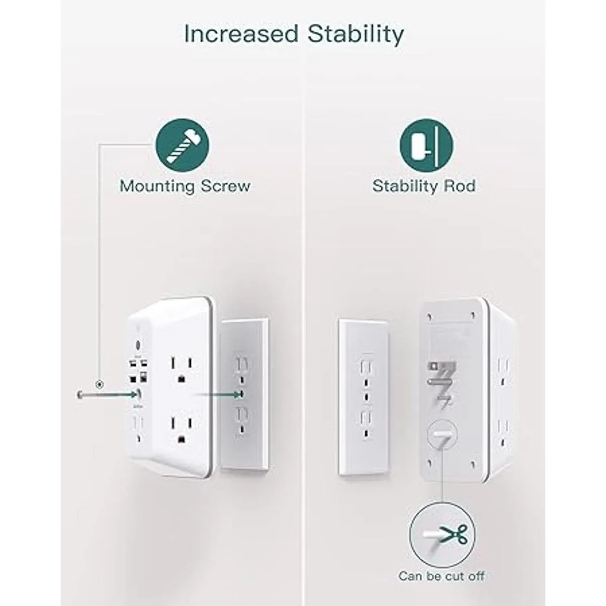 Toma de pared USB 9 en 1: obtienes 4 puertos de carga USB 1 USB C y 5 tomas de corriente espaciadas amplias; el extensor de enchufe de diseño lateral proporciona un gran espacio; la luz nocturna LED alrededor del borde del extensor de salida hace que la vida sea más conveniente; el tornillo extraíble y la punta de plástico hacen que se fije firmemente a las tomas de corriente