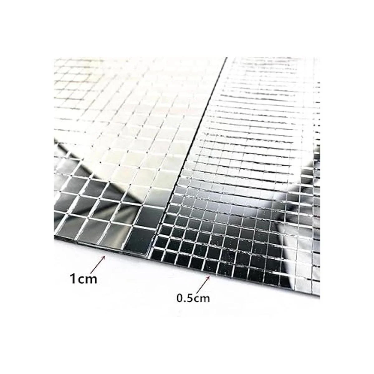 Cantidad: un juego viene con 1 hoja de mosaico de espejo autoadhesivo, el tamaño de cada hoja es de 7.9 in x 11.8 in. 2400 piezas pequeñas en total.
