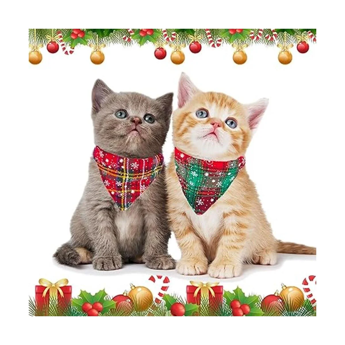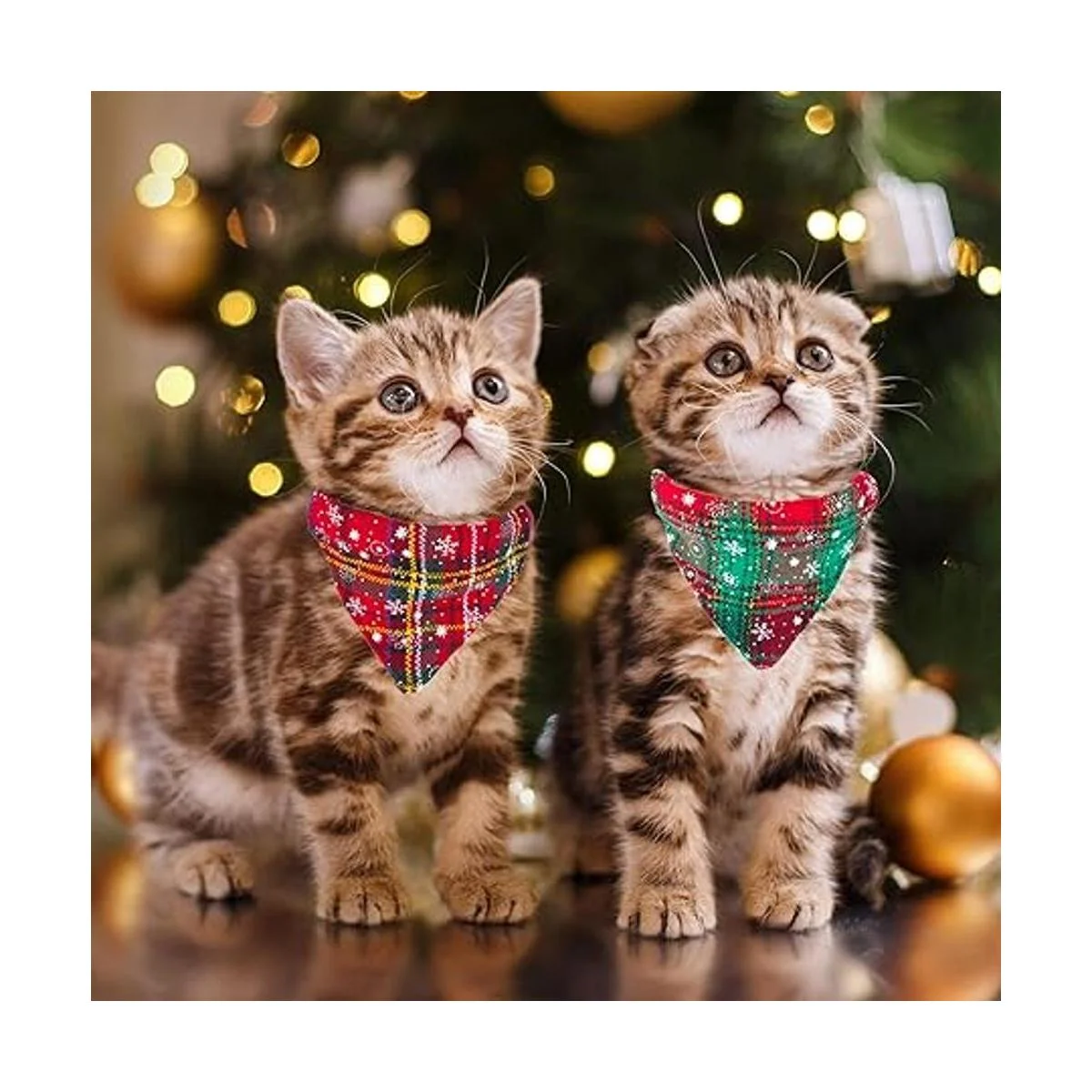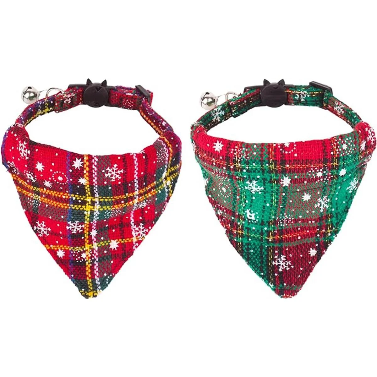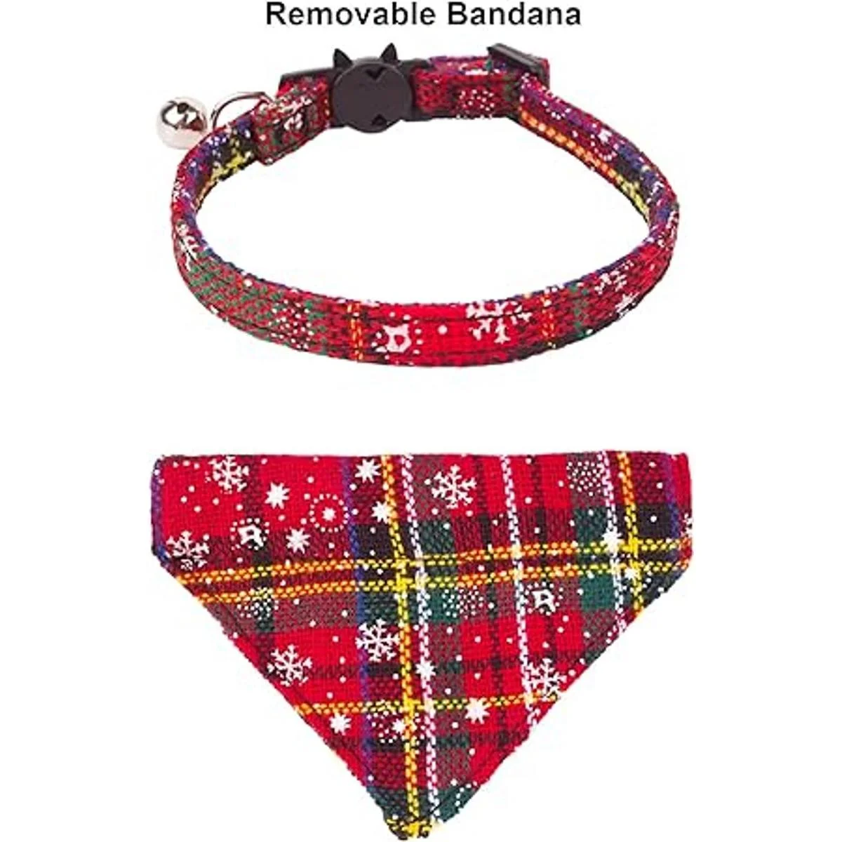 ADOGGYGO Christmas Cat Collars Breakaway with Bell, 2 Pack Adjustable Cat Collar with Removable Bandana, Red Green Plaid Snowflake Cat Bandana Collar for Kittens Cats
