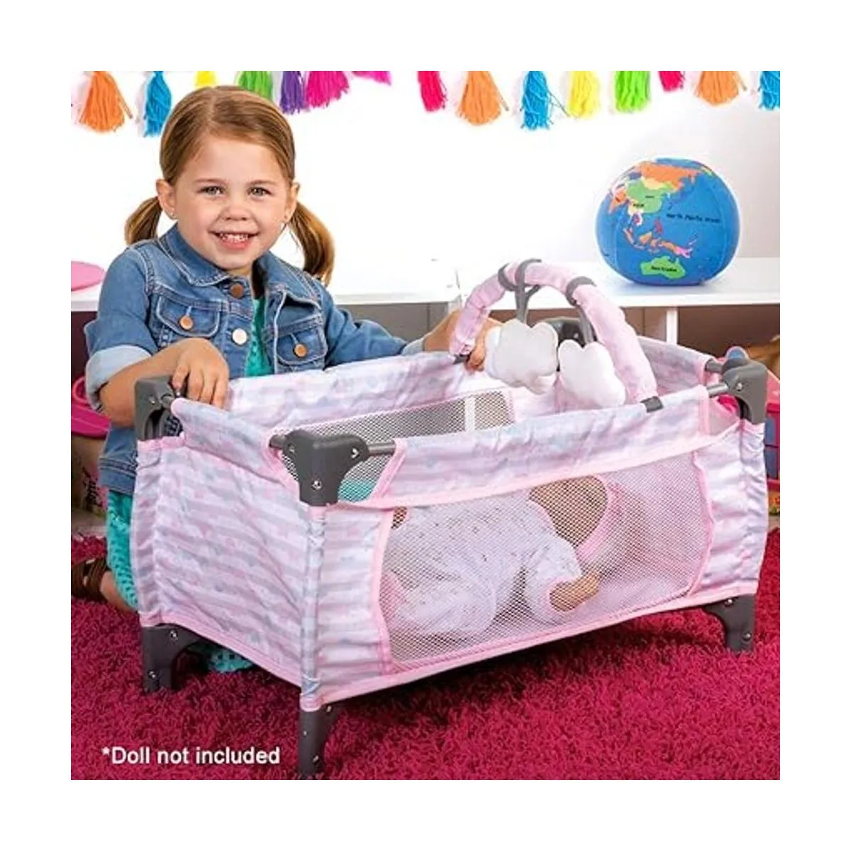 Fomenta el juego imaginativo. Este juego de 7 piezas puede adaptarse a la mayoría de muñecas de bebé, animales de peluche y felpa de hasta 20 pulgadas de longitud y viene con un corralito/cuna, cambiador, móvil con 3 nubes e incluso una bolsa de almacenamiento