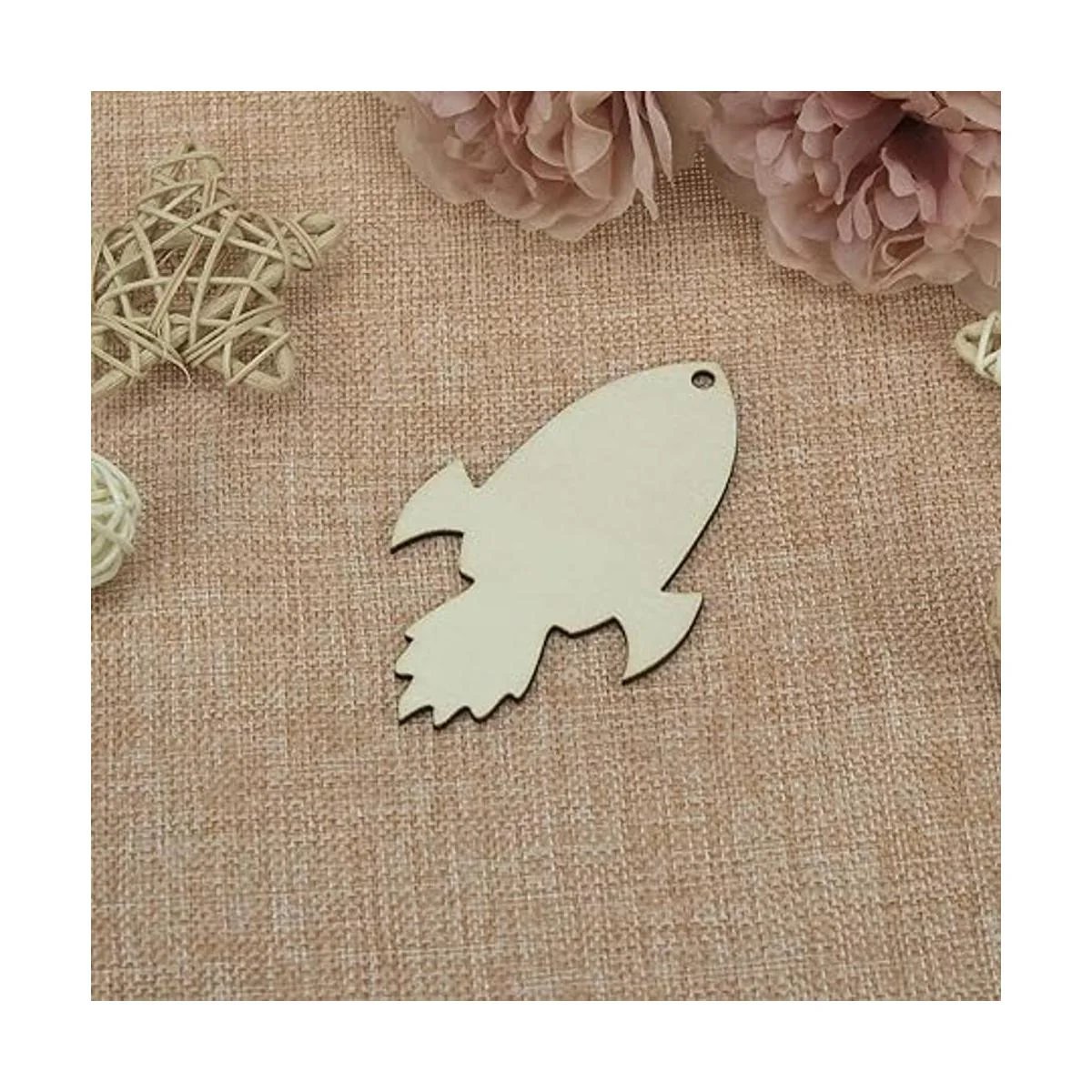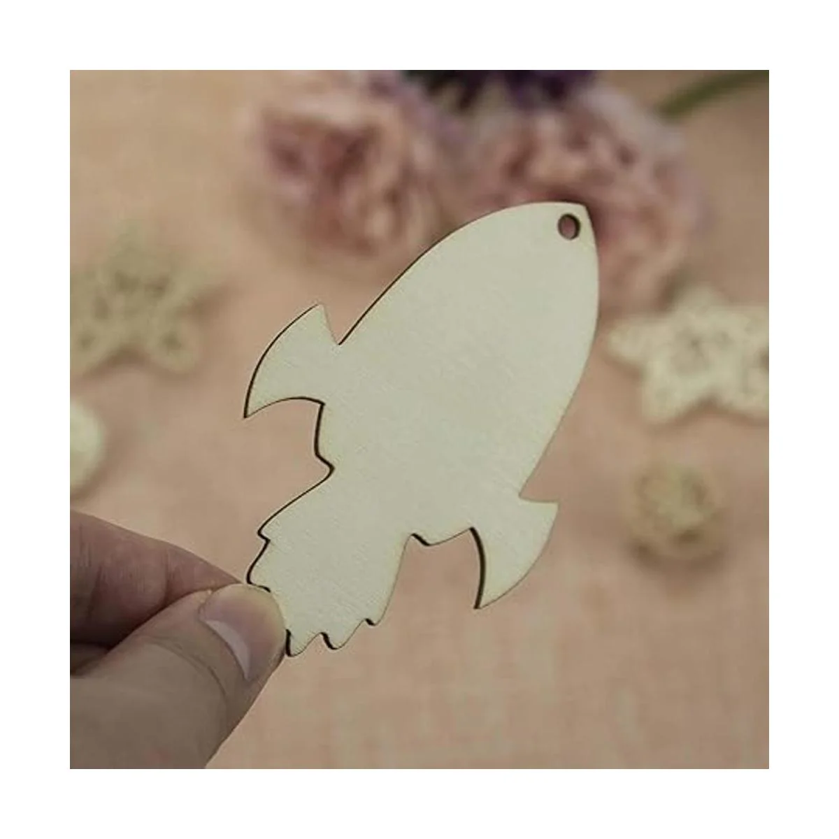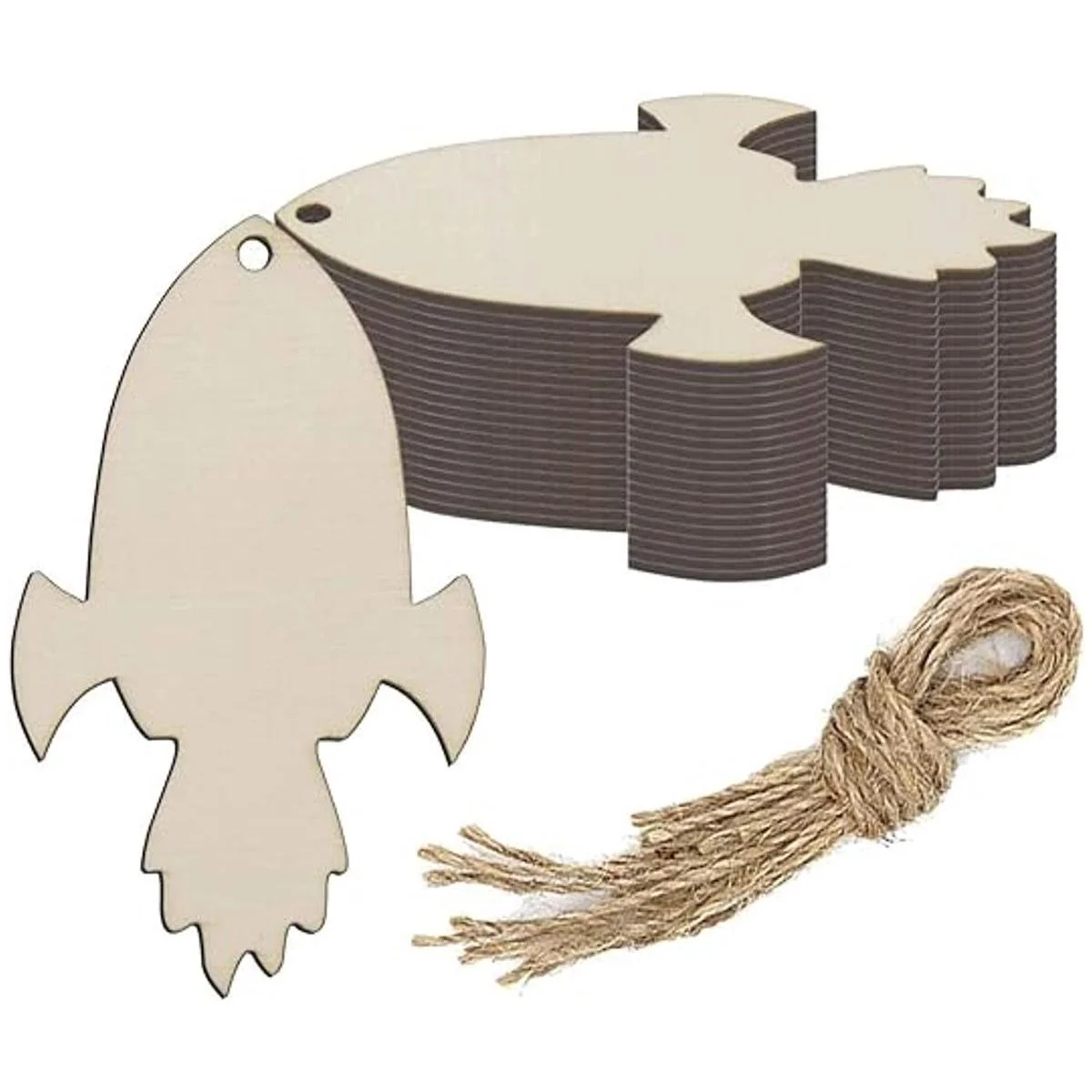 Características: diseño en forma de cohete de madera en blanco para colgar, con un agujero y cuerda, se puede utilizar para colgar decoración. Perfecto para usar como etiquetas, tablero de fiesta, tablero de aula.
