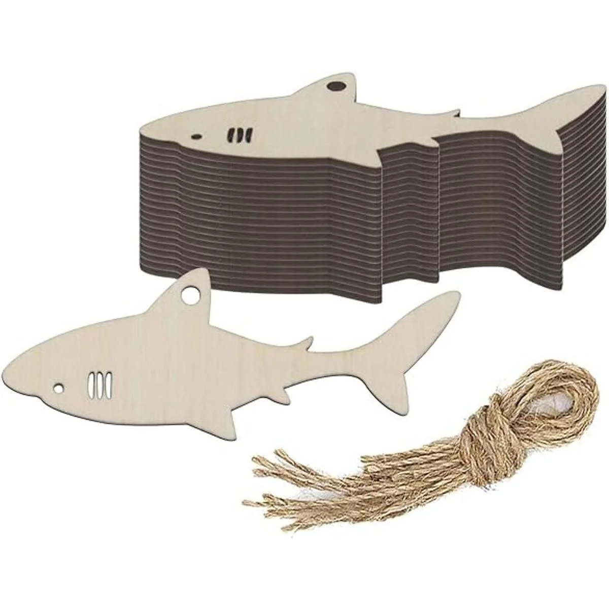 Adornos colgantes de madera en forma de tiburón con agujero de cuerda de cáñamo, etiqueta de regalo perfecta para bodas, cumpleaños, océano, decoración de fiestas temáticas de animales 3.94 x 1.5 pulgadas, 20 unidades