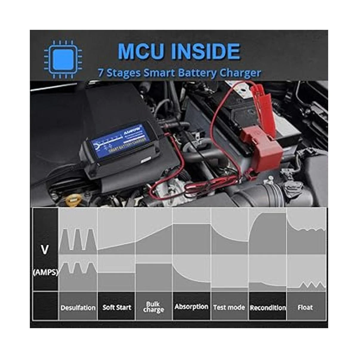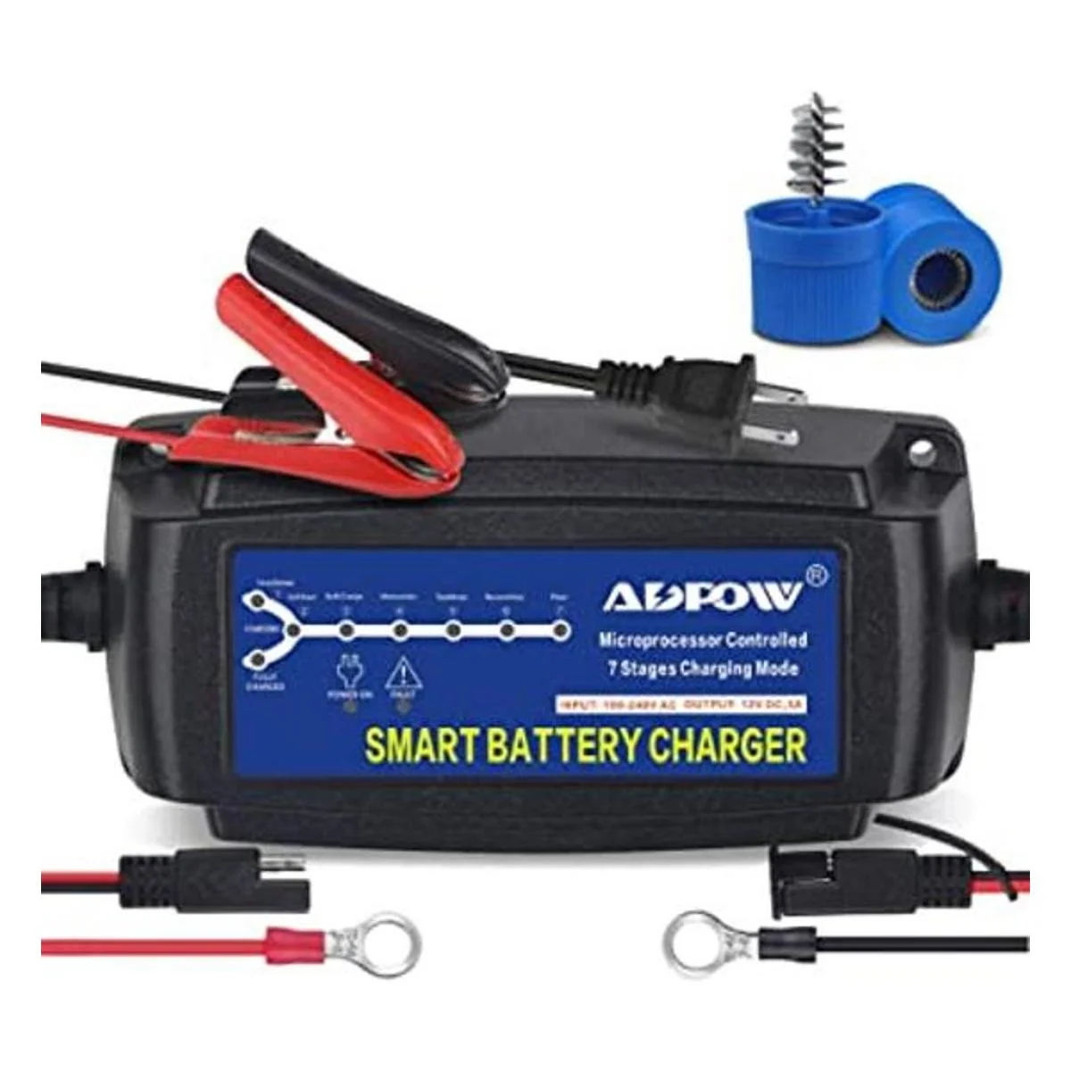 ADPOW Cargador de batería inteligente automático de 5 A, 12 V, para mantenimiento automotriz, 7 etapas, cargador de goteo para batería de ciclo profundo, coche, barco, camión, cortacésped, RV AGM, con cepillo de limpieza de terminales