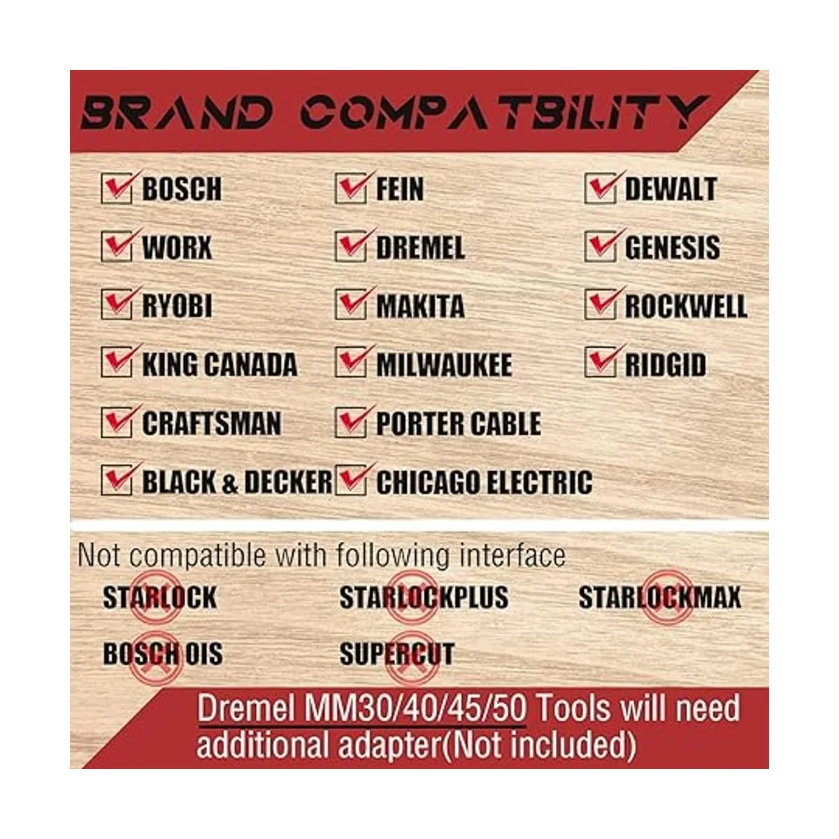 Funciona con herramientas eléctricas oscilantes: los kits de cuchillas multiherramientas de Adust de ajuste universal de cuchillas multiherramienta son compatibles con la mayoría de las principales marcas de herramientas oscilantes y sierras para cortar madera, como Dewalt, Fein Multimaster, Ryobi, Milwaukee, Hitachi, Black Decker, Chicago, Craftsman y más excepción: Fein Starlock, Bosch MX30, Fein Supercut, Dremel 40 y MM45 y Dremel Multi Max 6300