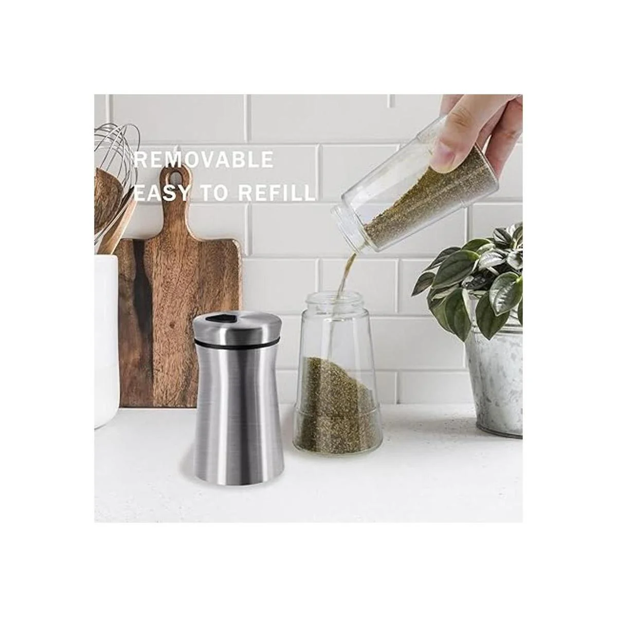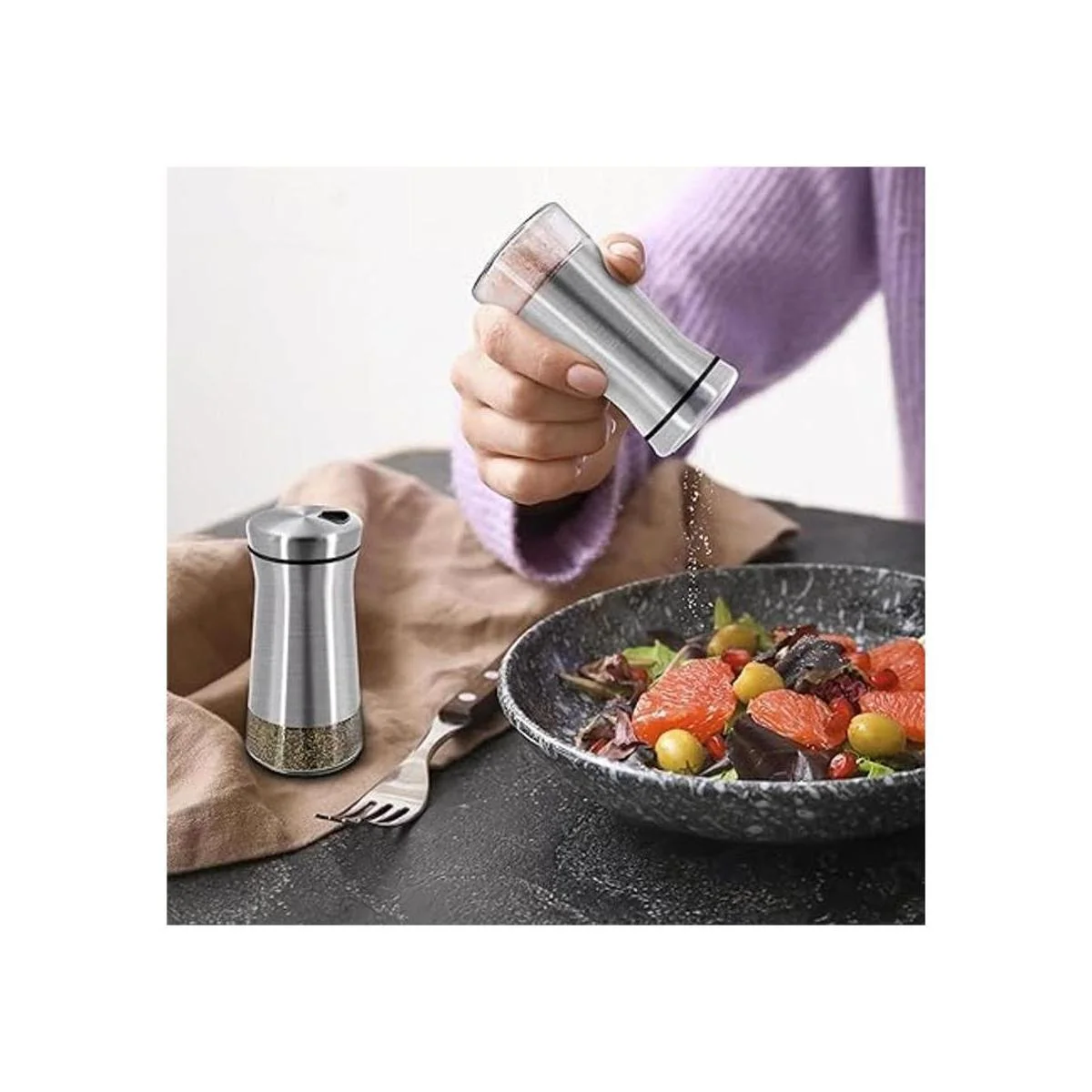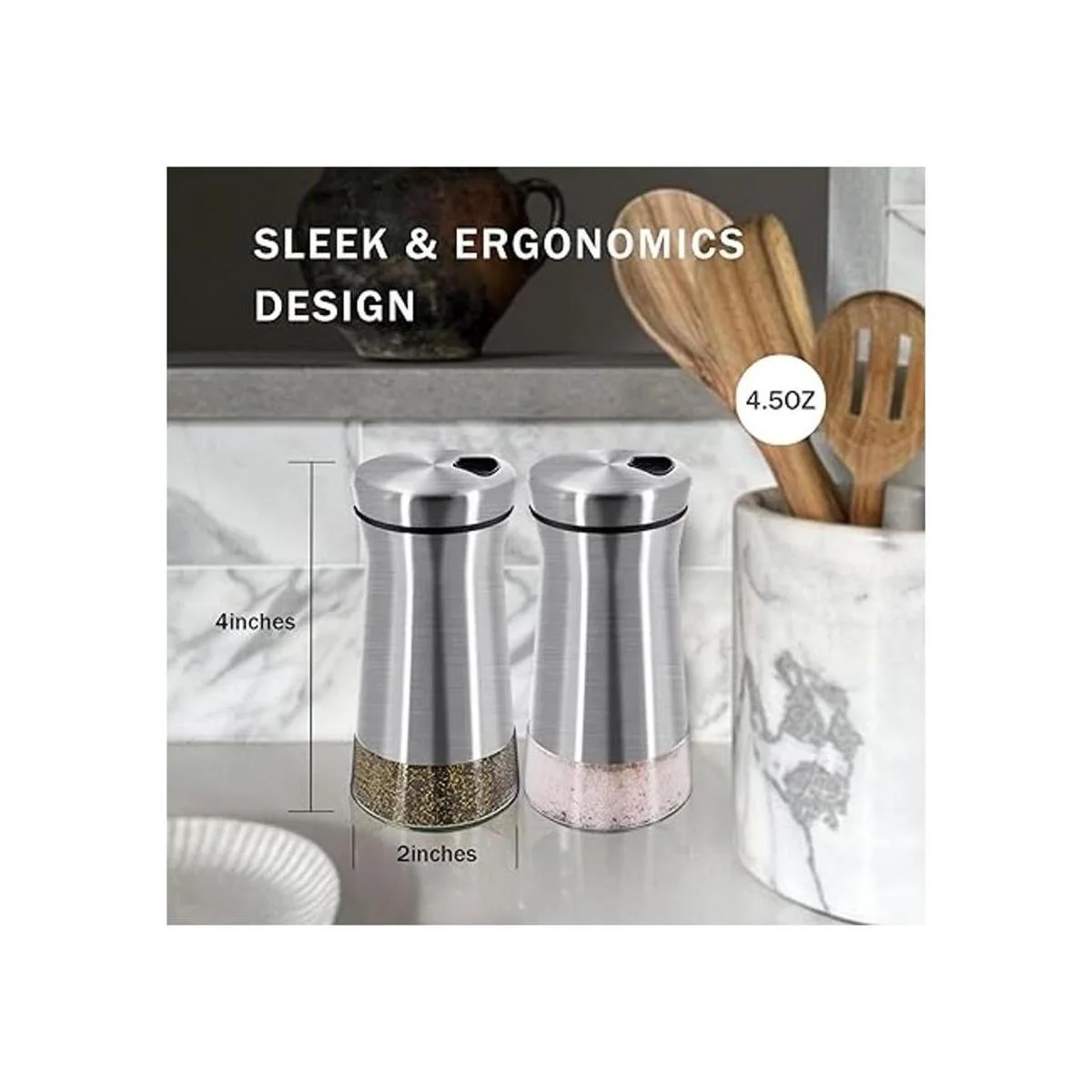 Material duradero y de alta calidad: los elegantes saleros y pimenteros están compuestos de vidrio de alta calidad, carcasa de acero inoxidable de grado alimenticio y tapa de plástico sin BPA. Este juego viene con dos cocteleras diseñadas para sal de mesa regular y pimienta molida, pero también puede acomodar especias finas y gruesas.