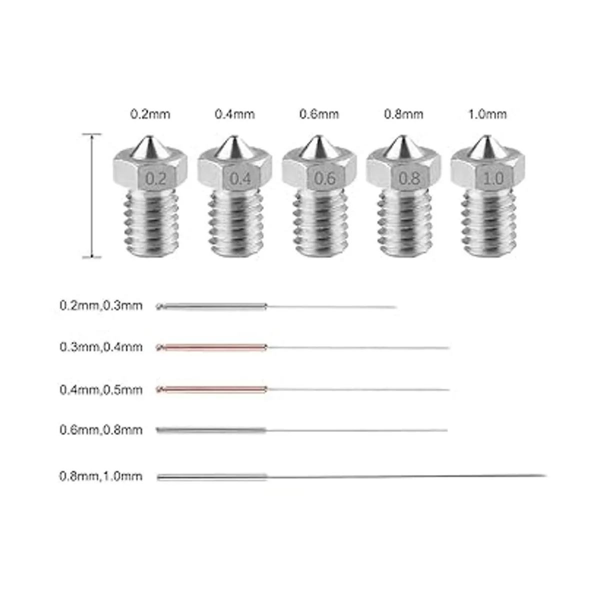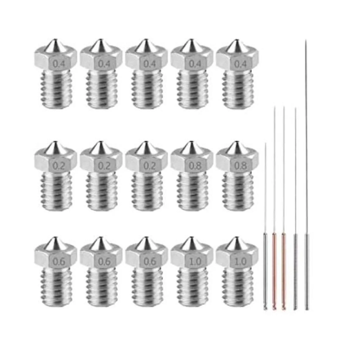 AFUNTA 15 boquillas de acero inoxidable M6 3D para impresora 3D, extrusora compatible con Makerbot y ANET A8, 5 tamaños 0.20.40.60.80.039 in 5 tamaños de agujas de limpieza