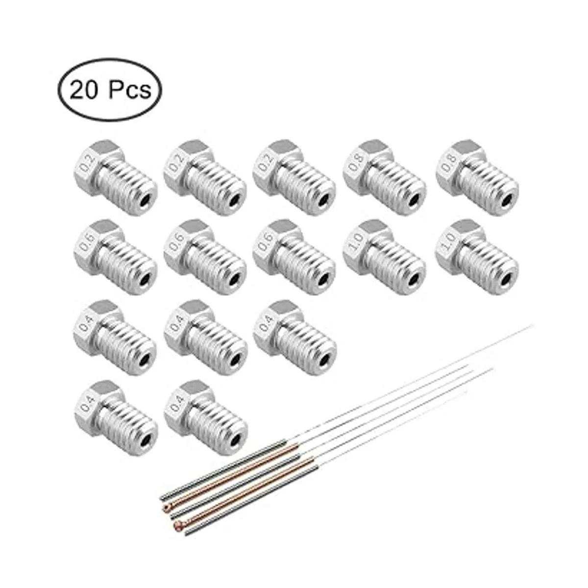 Agujas de limpieza de boquillas: 5 agujas de limpieza tienen 5 tamaños diferentes: 0.008 in, 0.016 in, 0.024 in y 0.031 in, adecuadas para limpiar la mayoría de tus boquillas de impresora 3D.