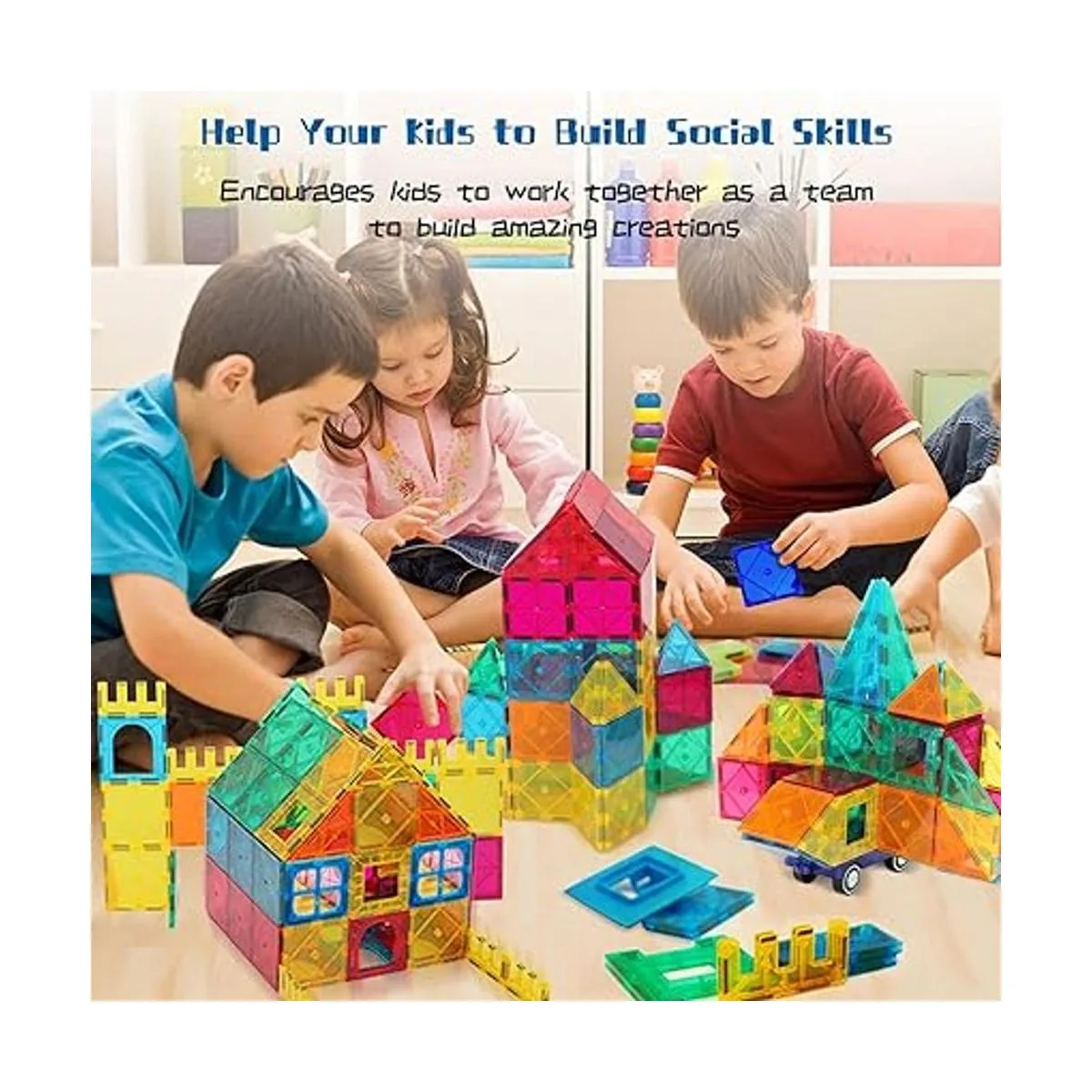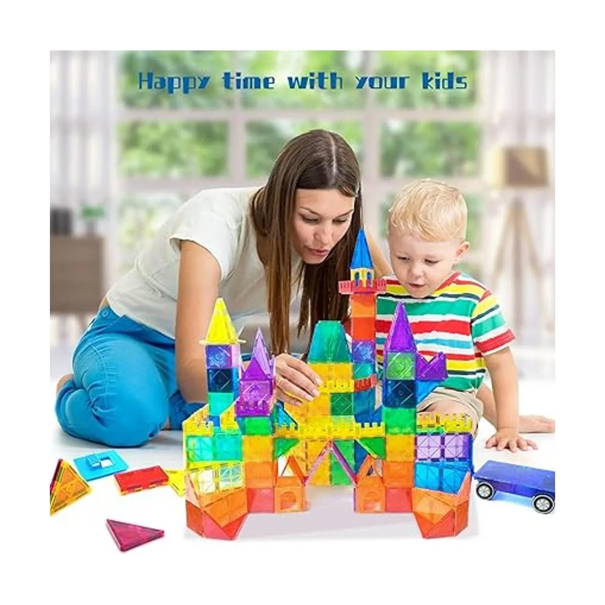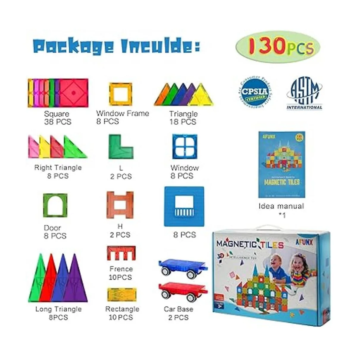 AFUNX 130 piezas de bloques magnéticos de construcción 3D transparentes bloques magnéticos 3D, tableros de juegos de construcción, azulejos de construcción de inspiración, creatividad más allá de la imaginación, juego de juguetes magnéticos educativos para niños con 2 coches