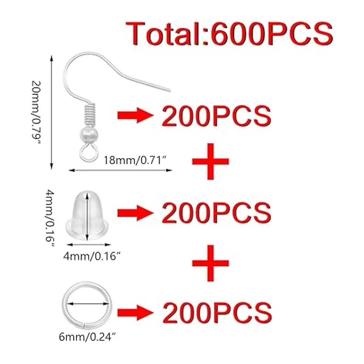 Kit de fabricación de pendientes: cada kit incluye 200 ganchos para pendientes, 200 anillos abiertos y 200 cierres de goma transparente. Este kit tiene un número suficiente de accesorios para la fabricación de pendientes. No necesitas comprarlos por separado. Cada juego está empaquetado en una caja de plástico. El anillo abierto y la parte trasera de los pendientes de goma están empaquetados en una bolsa de plástico para evitar daños. Se puede utilizar con confianza