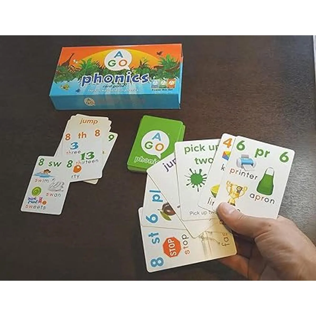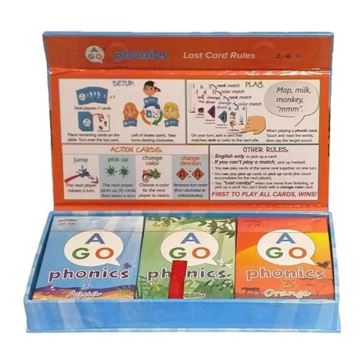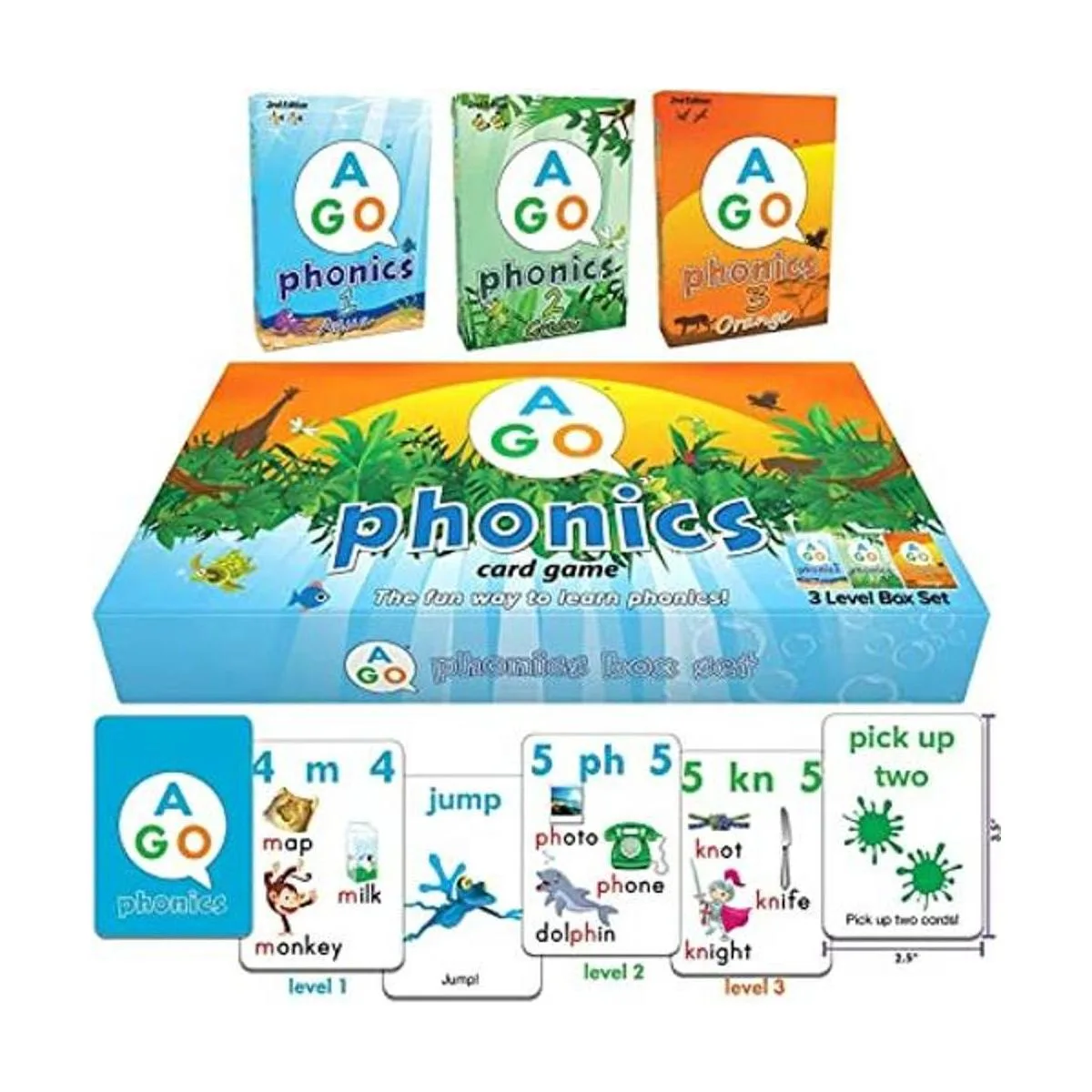 AGO Juego de cartas Phonics juego de caja de 3 niveles. Construye habilidades de lectura, aprende palabras y sonidos fonéticos, todo mientras juegas un divertido juego de cartas. Incluye 3 mazos de cartas en una caja magnética.