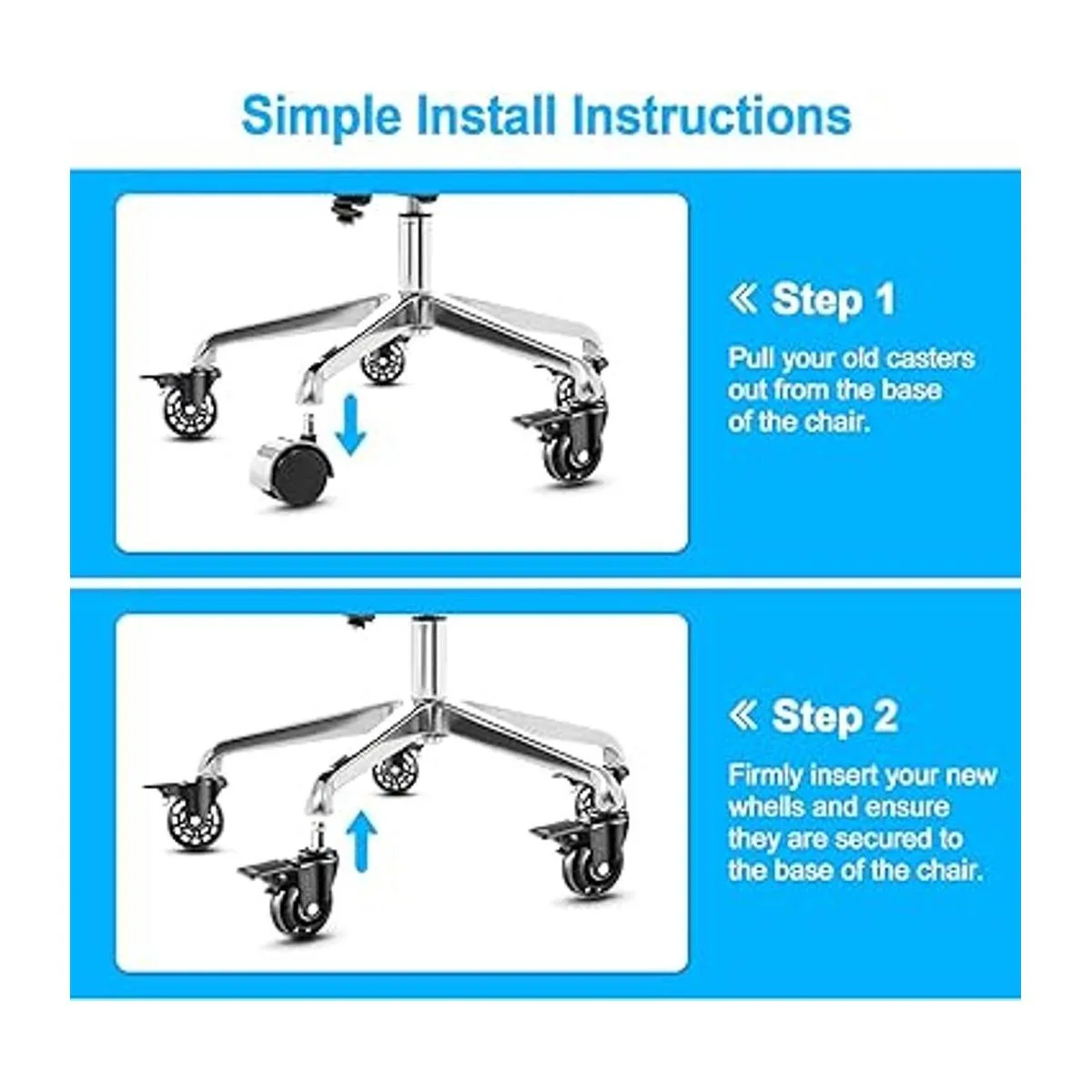 Ajuste universal: nuestras ruedas de silla de oficina están diseñadas con estándar universal. Se adaptan a casi todas las sillas de oficina estándar vendidas en el mercado.