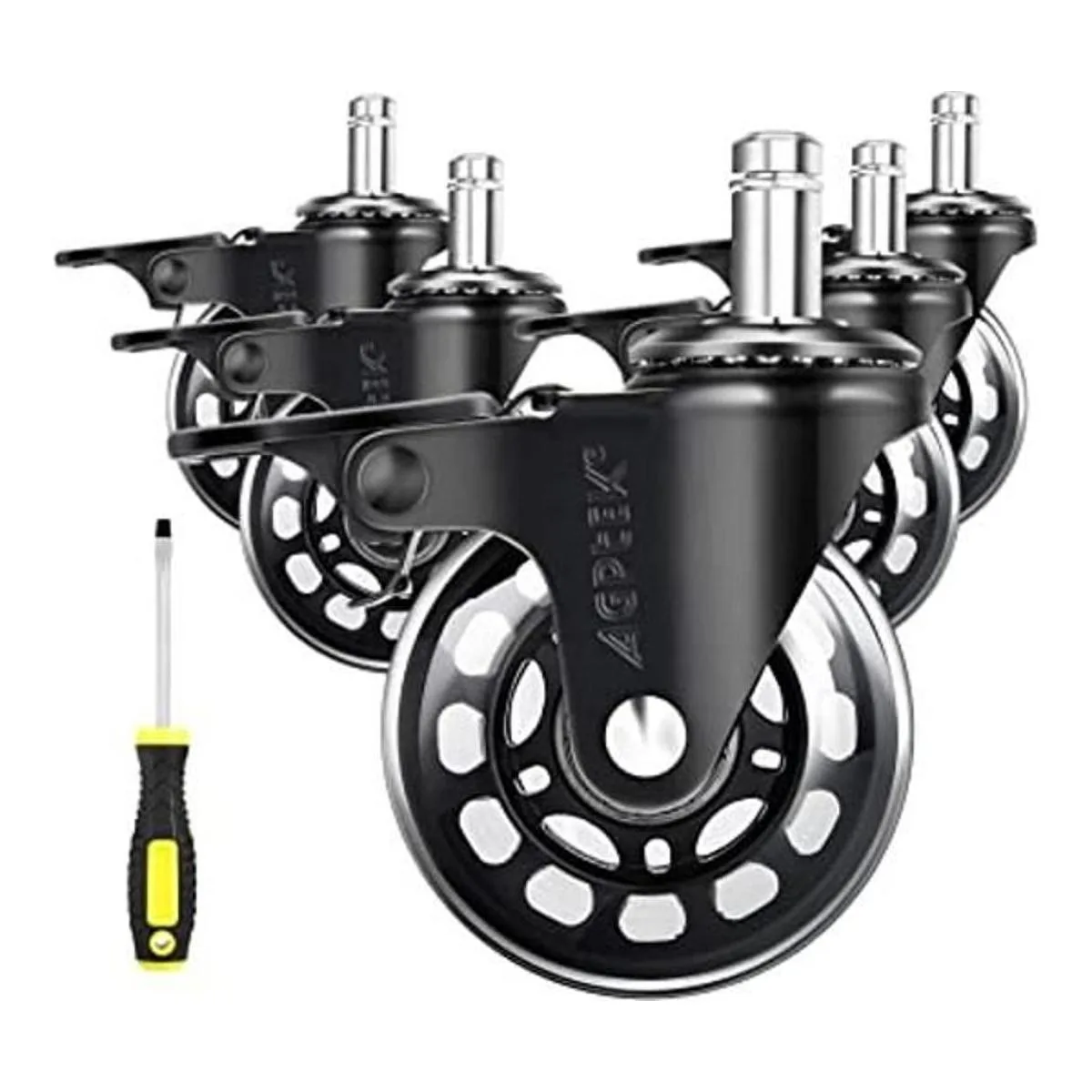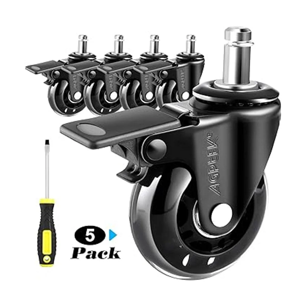 AGPTEK Ruedas para silla de oficina, resistentes, con destornillador, ruedas de rodillo seguras de repuesto para suelos de madera dura, alfombras, azulejos, juego de 5 con sistema de freno.