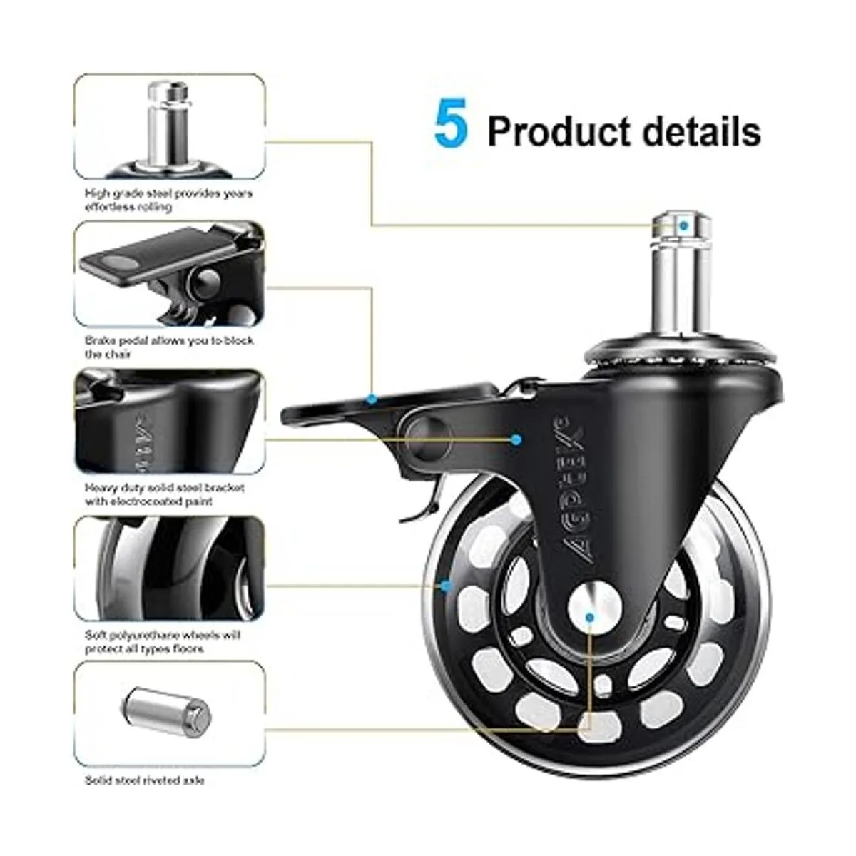 Juego de 5 ruedas con sistema de freno único: cada silla de oficina es de 2.5 in, se adapta a la mayoría de sillas de oficina. Todas estas ruedas tienen sistema de freno para ayudarte a controlar las ruedas cuando quieras que dejen de rodar.