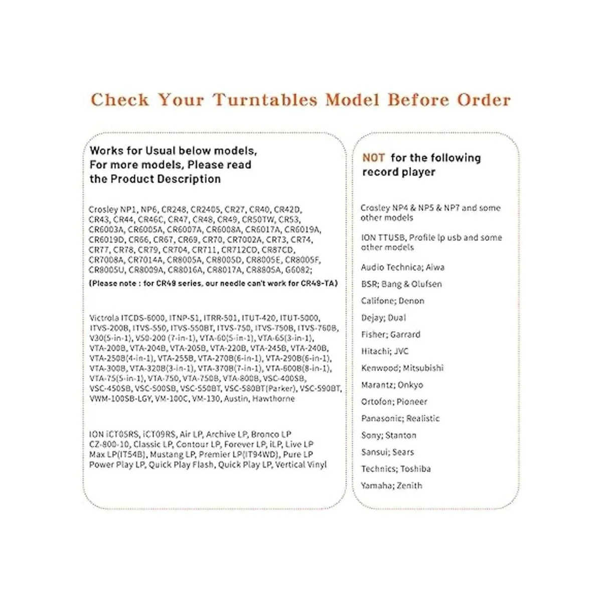 Amplia compatibilidad: compatible con la mayoría de los tocadiscos en los mercados ahora. Compatible con: Crosley, ION no todos los modelos son compatibles, Pyle, Jensen, Victola, 1byone, Teac y más. Por favor, lee los detalles del producto del modelo aplicable, si no estás seguro, por favor consulta con nosotros primero