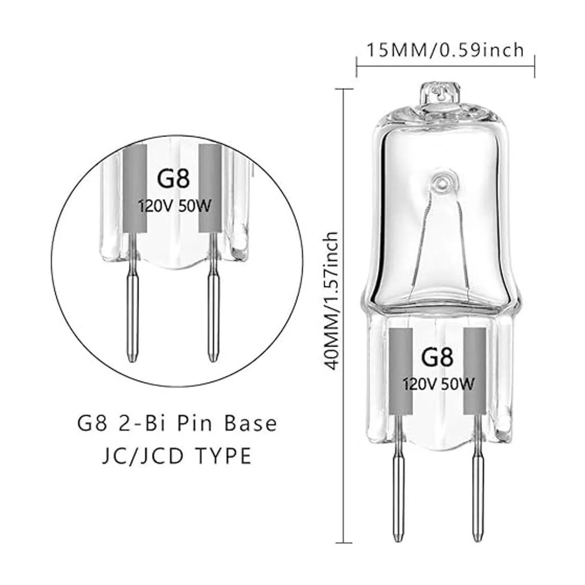 AHEVO Bombillas G8 de 50 W, 120 V, bombilla halógena G8, base bipasador, 50 W, T4, JCD, blanco cálido, reemplazo de iluminación para debajo del gabinete, paquete de 10 unidades