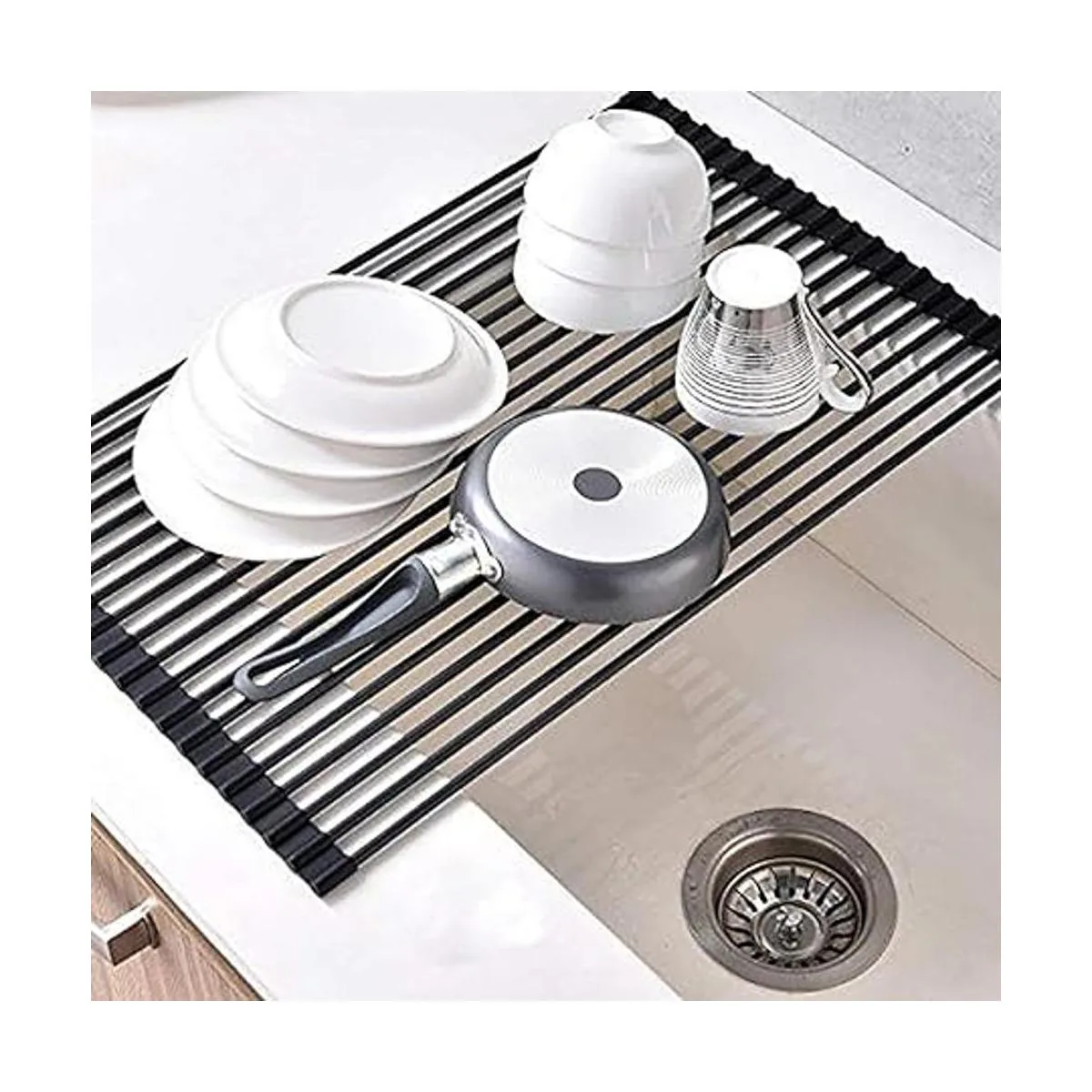 Ahyuan Estante de secado de platos grande enrollable plegable sobre el fregadero, escurridor, escurridor, escurridor, de silicona, con revestimiento de acero inoxidable negro mate