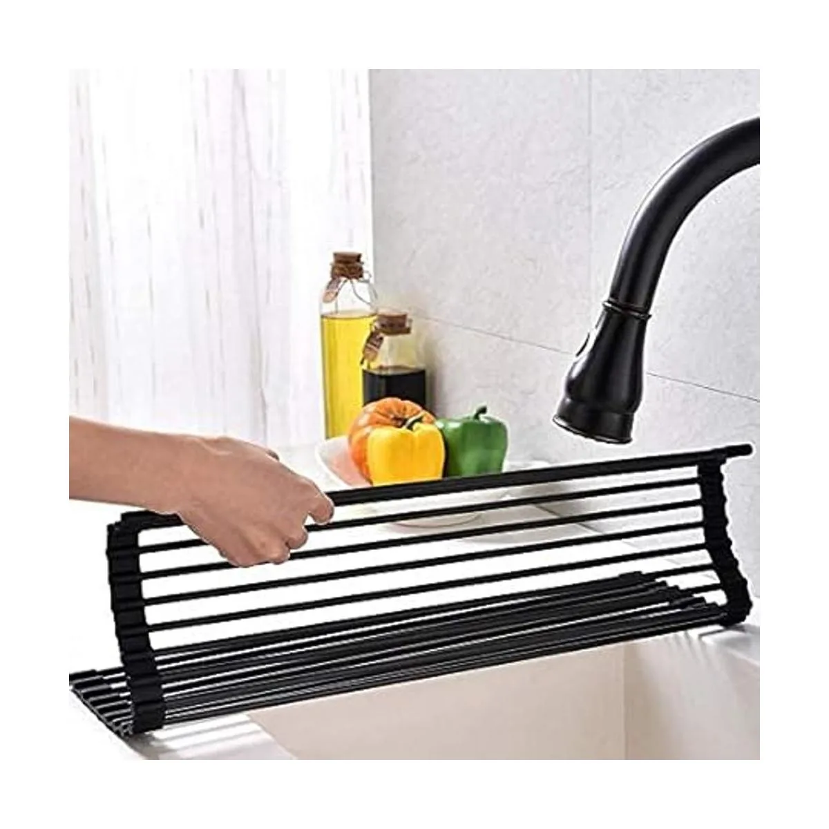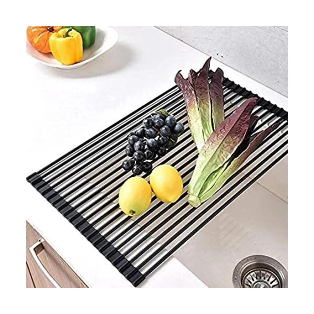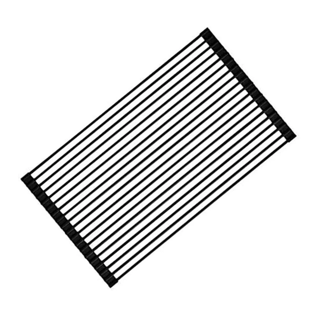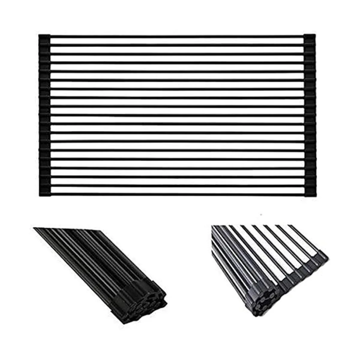 Ahyuan Estante de secado de platos grande enrollable plegable sobre el fregadero, escurridor, escurridor, escurridor, de silicona, con revestimiento de acero inoxidable (negro mate)