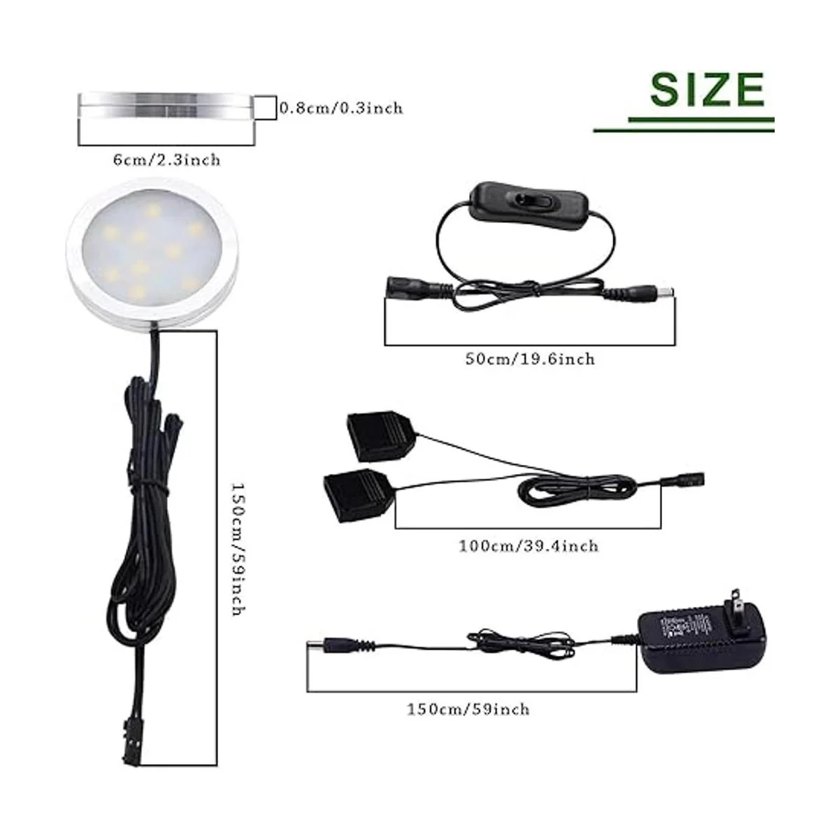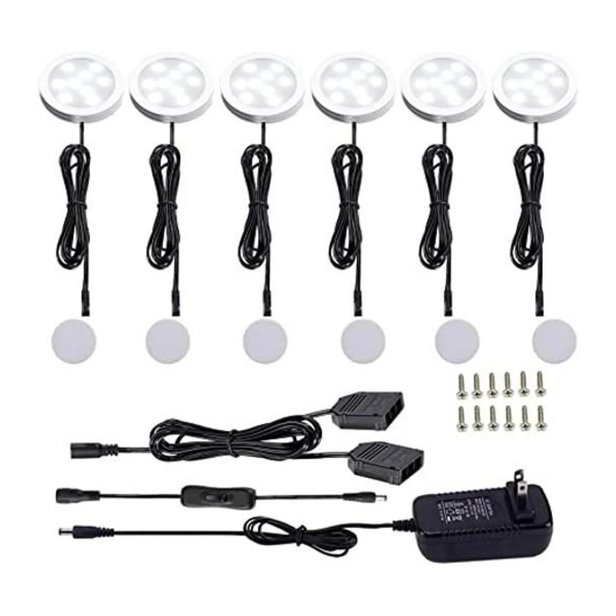 AIBOO Kit de luces LED para debajo del gabinete de 12 V, paquete de 6 lámparas de disco de aluminio con cable negro para iluminación de encimera de cocina, armario con interruptor manual de encendidoapagado de 12 W, 6 luces luz diurna de 6000 K, blanco