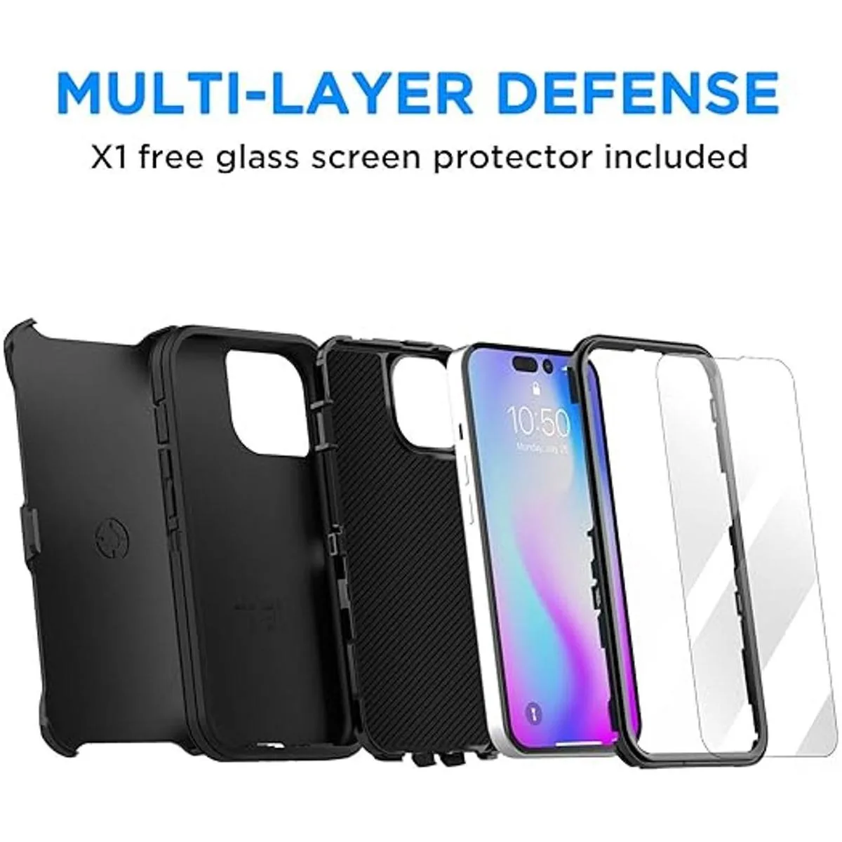 Defensa de varias capas: carcasa interior de policarbonato sólido, cubierta exterior de goma suave, funda incluida que funciona como un clip para cinturón y un soporte manos libres. Combínalo con un protector de pantalla de vidrio AICase bono para una protección total de cuerpo completo de 360 grados para tu iPhone 14 Pro Max