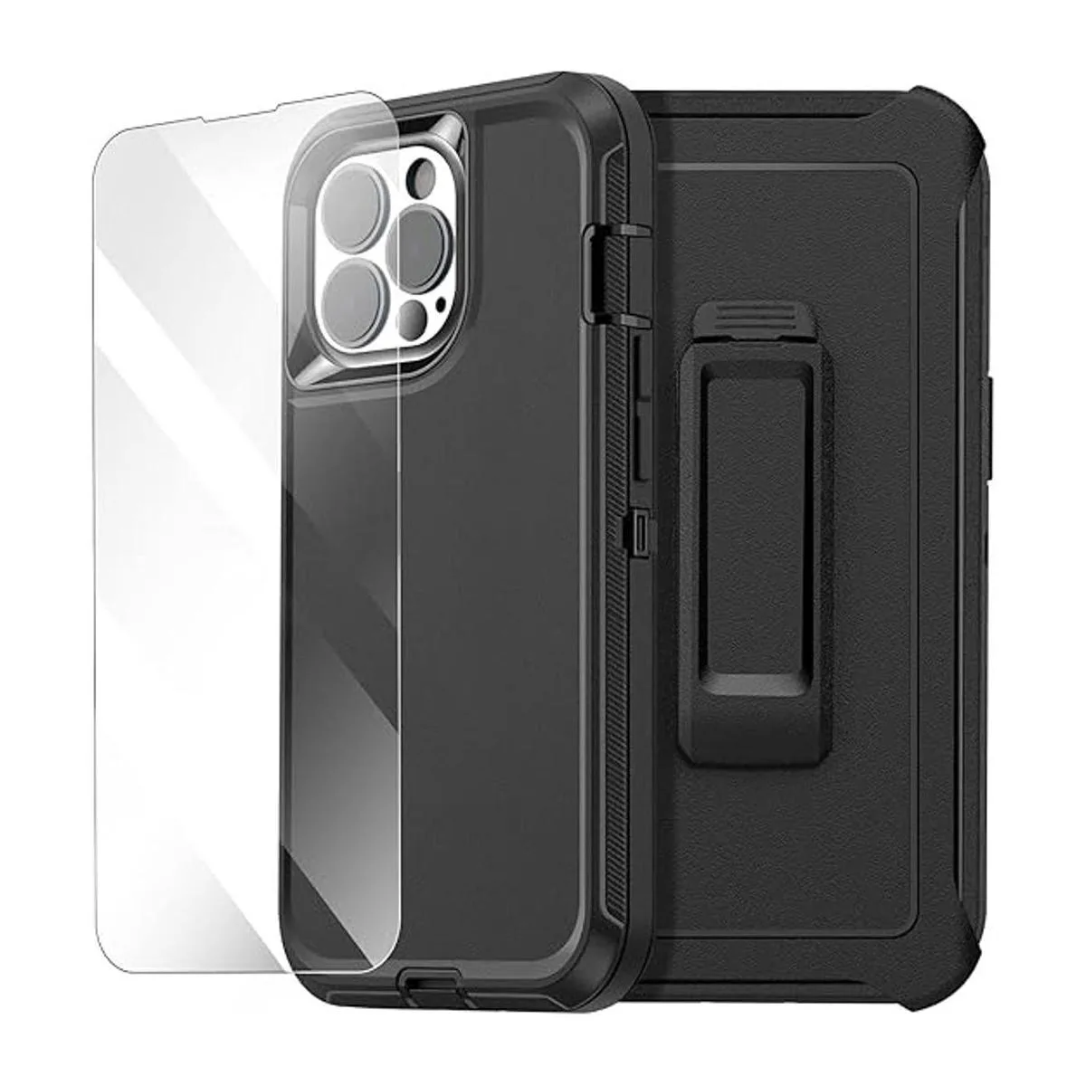 AICase Funda con clip para cinturón para iPhone 14 Pro Max (6.7 pulgadas) con protector de vidrio, protección resistente contra caídas de cuerpo completo, resistente a los golpes, a prueba de polvo, grado militar, resistente y duradera para iPhone 14 Pro Max
