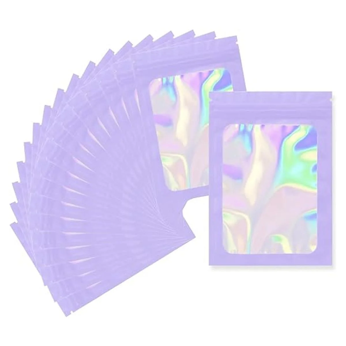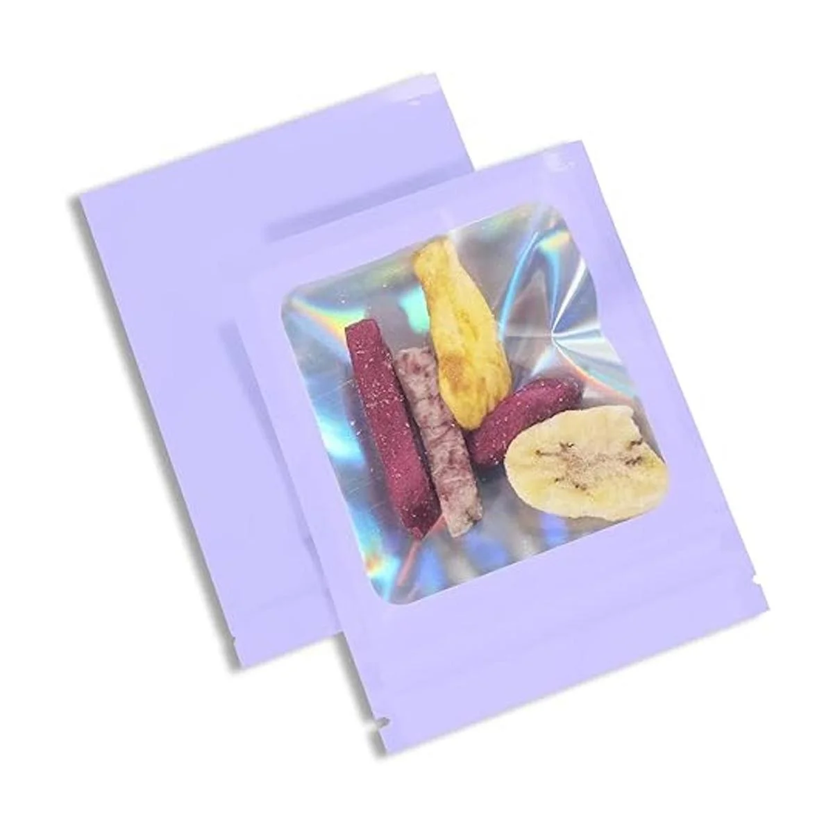 AICTIMO Paquete de 100 bolsas de Mylar 5.5 x 7.8 pulgadas resellables a prueba de olores, bolsa plana con ventana frontal, color morado