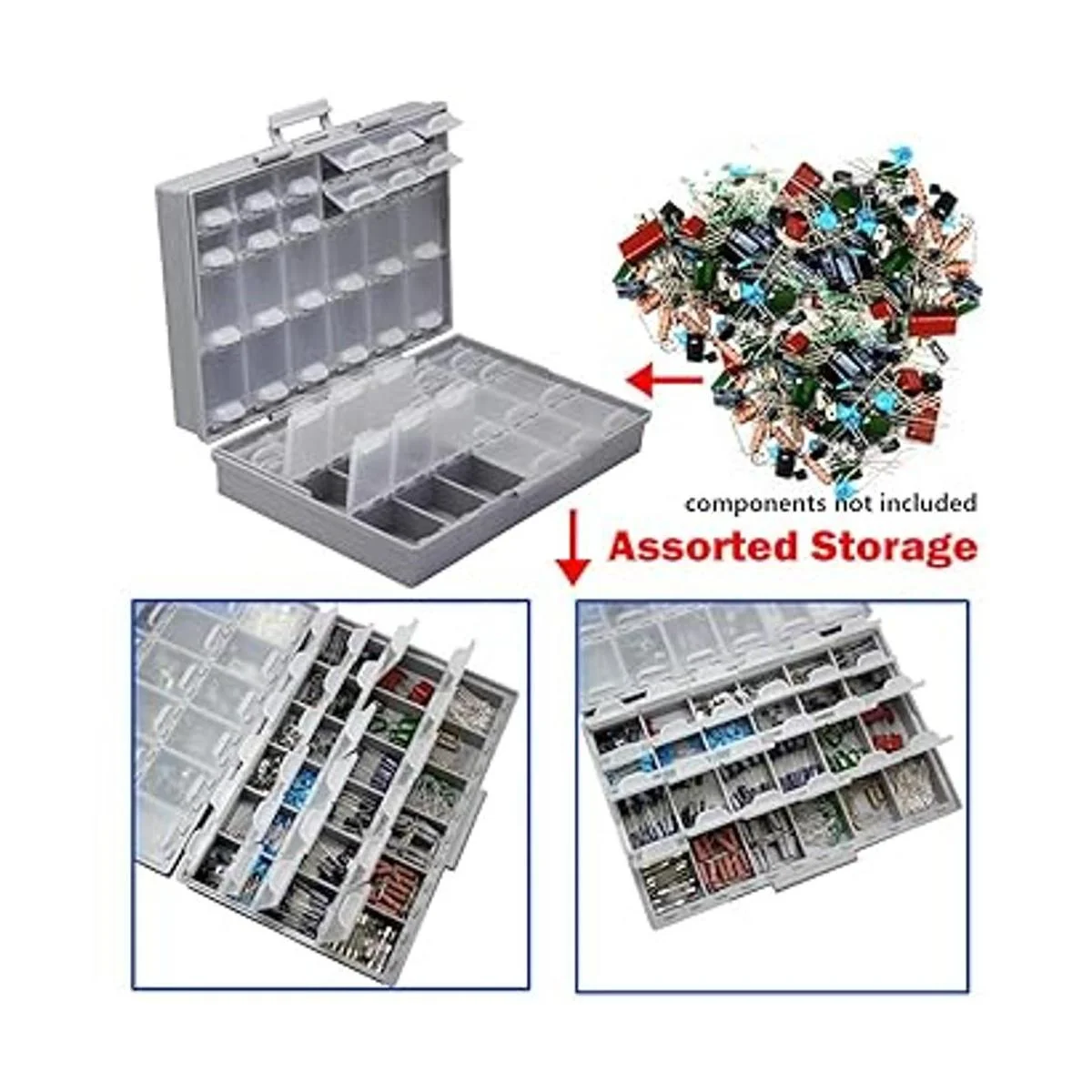Los compartimentos de tamaño: 24 compartimentos de tamaño pequeño miden 0.875 pulgadas de largo x 1.44 pulgadas de ancho x 0.81 pulgadas de alto o 0.9 in de largo x 1.4 in de ancho x 2.06 pulgadas de alto, puede contener hasta 500 24 compartimentos de tamaño grande que miden 1.81 pulgadas de largo x 1.5 pulgadas de ancho x 0.81 pulgadas de alto L x 3,8 L x cm de ancho x 0.8 in de alto, puede contener hasta 1000 resistencias/condensadores de tamaño 1206