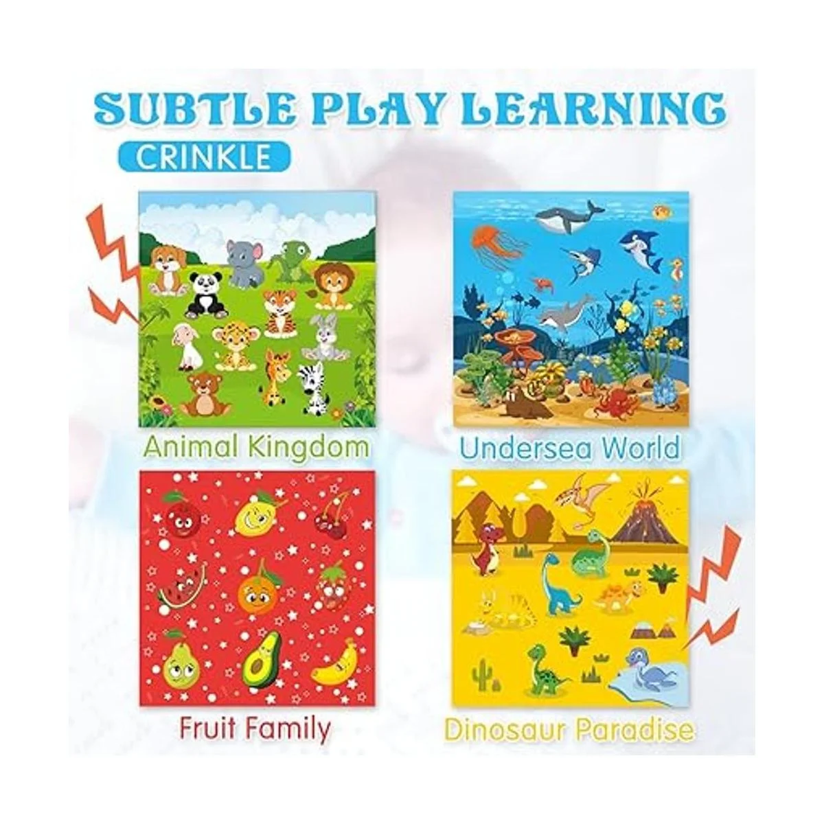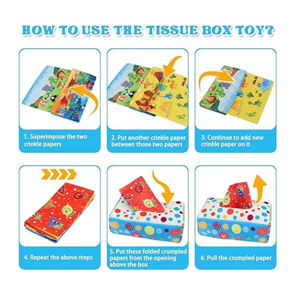 Caja de pañuelos mágica para bebé: nuestro juguete de caja de pañuelos proporciona 4 papeles arrugados multitemas y 10 bufandas de seda coloridas para que los niños pequeños de un año jueguen. Atrae a los niños con colores vibrantes y sonido arrugado, que promoverá sus habilidades de motricidad fina, distinguirá colores, estimulará el desarrollo de su audición y visión, y ejercitará su iluminación cerebral temprana