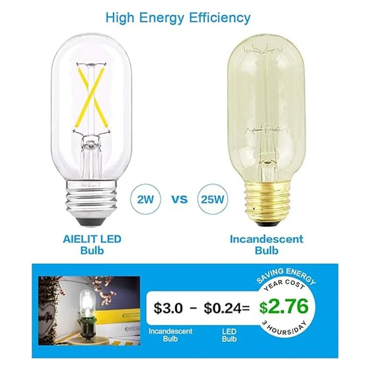 Ahorro de energía: las bombillas LED equivalentes a 25 vatios ahorran más del 90 de energía, disminuyen drásticamente tu factura de electricidad cuesta anual solo 0.24 basado en 3 horas/día. Larga vida útil: la bombilla de filamento LED AIELIT T45/T14 proporciona 25.000 horas de vida útil, resolviendo la molestia del reemplazo frecuente de bombillas