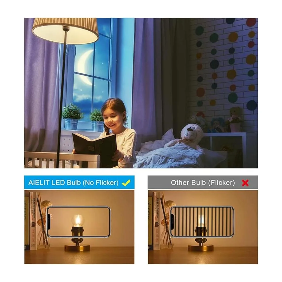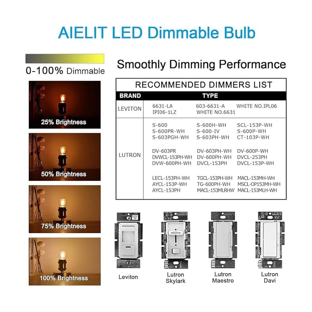 Totalmente regulable: las bombillas LED AIELIT E26 se regulan suavemente de 0 a 100 , ajustando el brillo para adaptarse a cualquier ajuste con estas bombillas de globo regulables, aptas para el 98 de reguladores en el mercado, se recomienda usar con un regulador Leviton o Lutron lista en la descripción a continuación para obtener los mejores resultados, sin parpadeo, sin luz estroboscópica, sin ruido y encendido instantáneo.