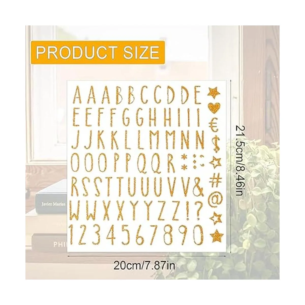 Aspecto brillante: nuestras pegatinas de letras y números están diseñadas con un aspecto dorado con purpurina. Pegar estas calcomanías con purpurina en tus álbumes de recortes o cajas de regalo es llamativo y elegante, lo que puede traerte un buen estado de ánimo. También puedes elegir y combinar estos alfabetos, números, estrellas, corazones de amor de acuerdo a tus necesidades. Da rienda suelta a tu imaginación y creatividad al contenido de tu corazón
