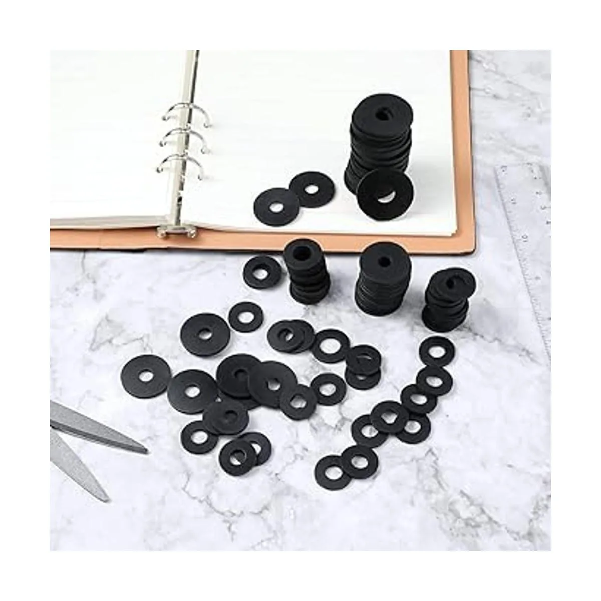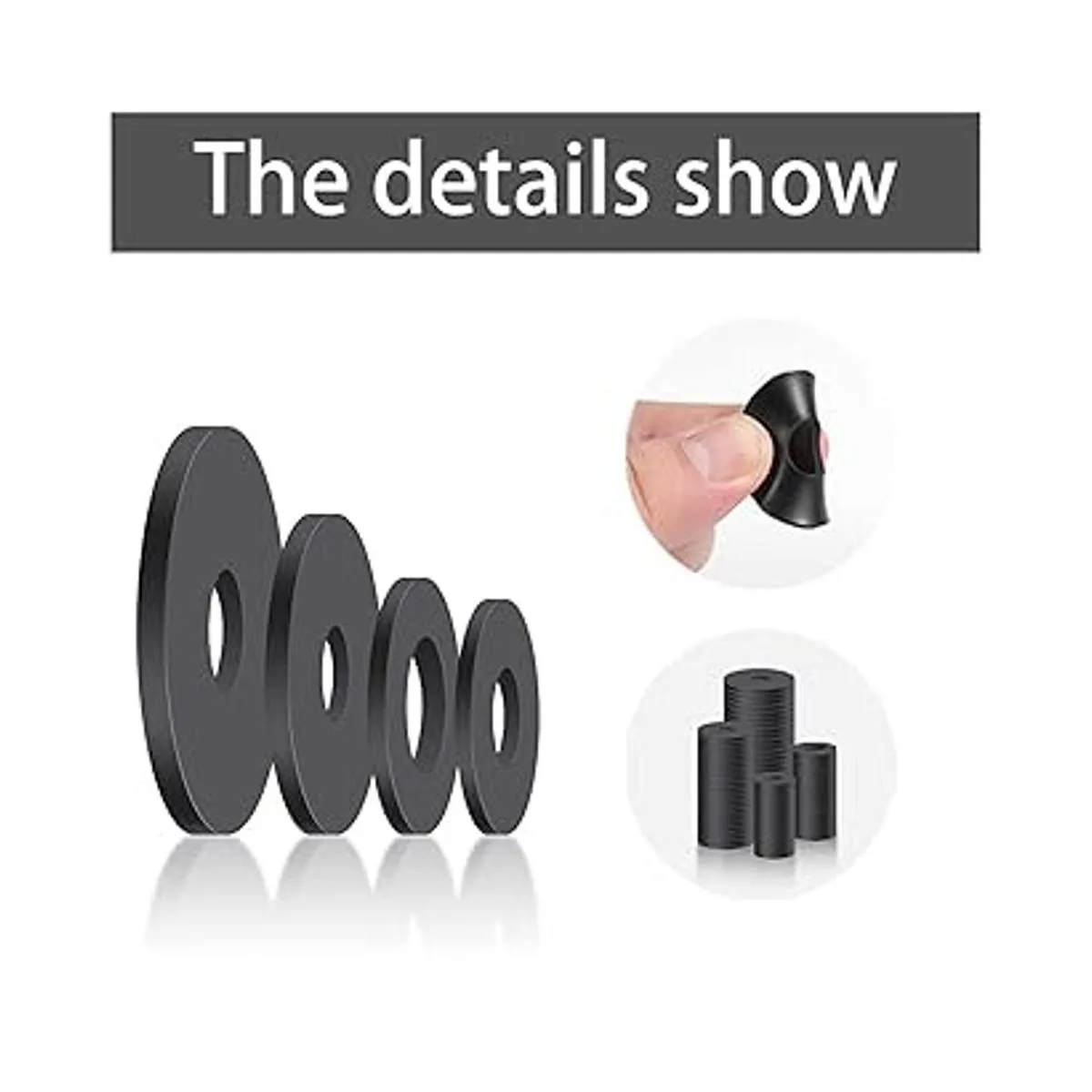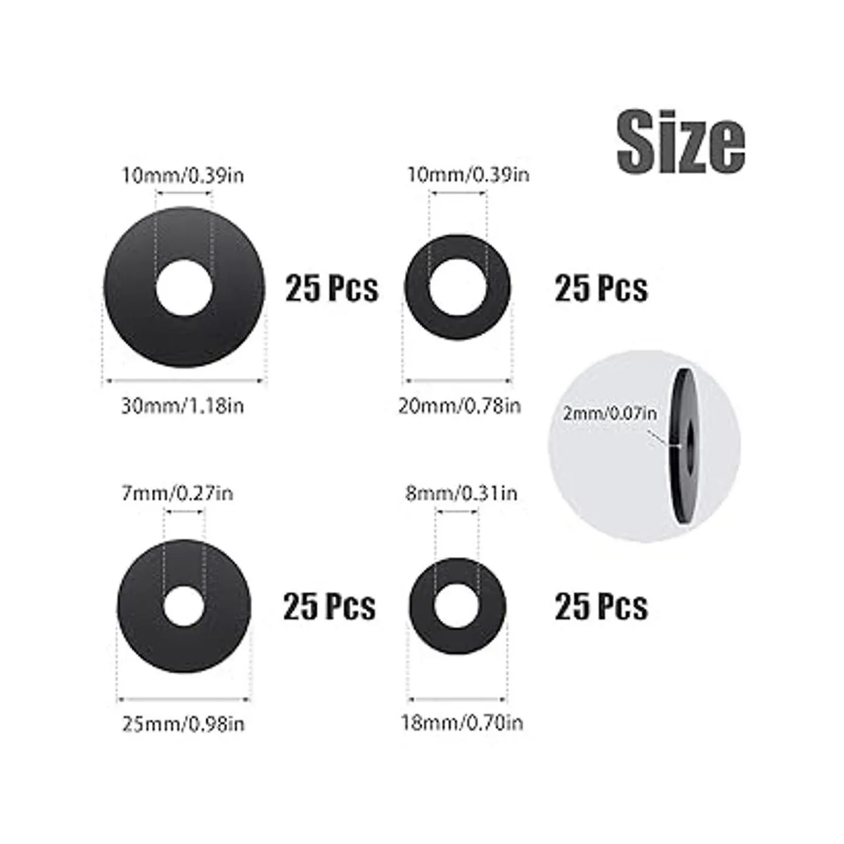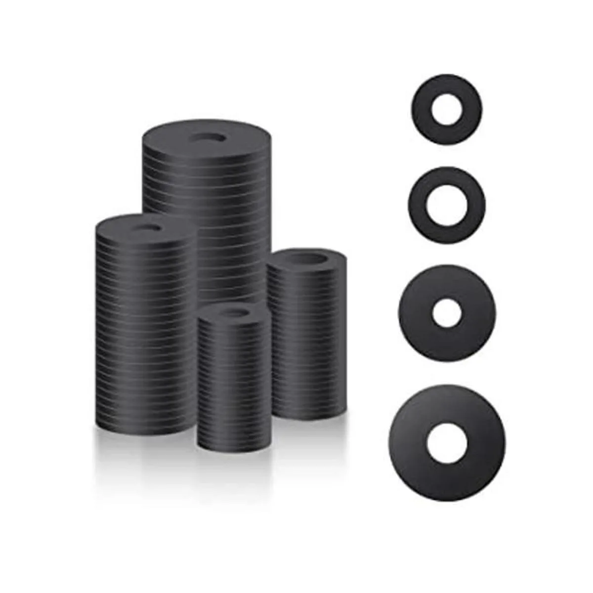 Contenido del paquete: recibirás 100 arandelas de goma planas en 4 tamaños diámetro exterior x diámetro interior incluyendo 0.709 x 0.315 in, 0.787 x 0.394 in, 0.984 x 0.276 in, 1.181 x 0.394 in. Y cada arandela de goma tiene un grosor de 0.079 in. La cantidad y tamaños son suficientes para satisfacer tus necesidades de uso diario y reemplazo.