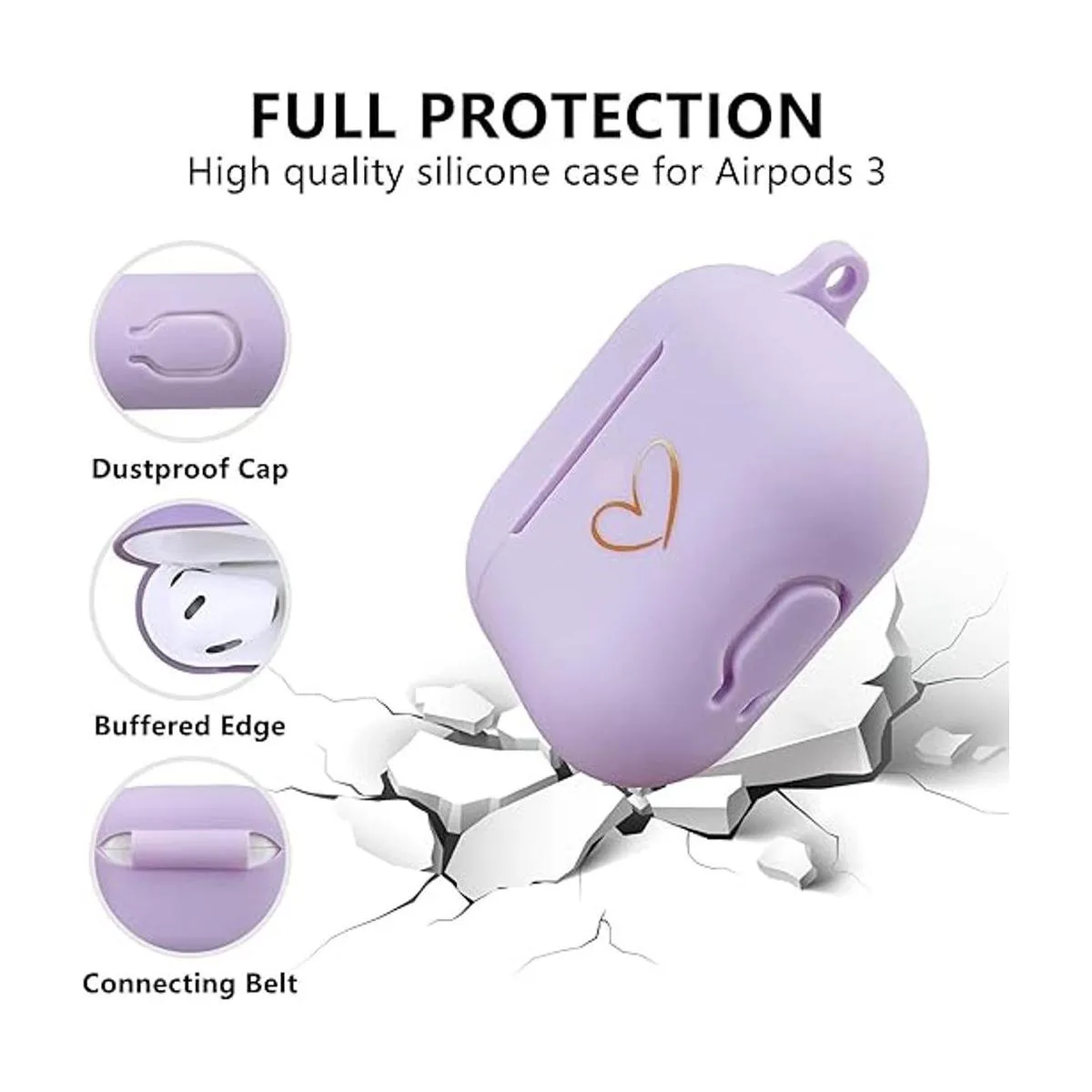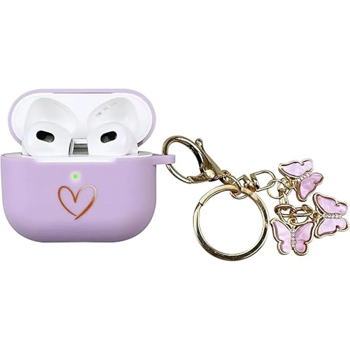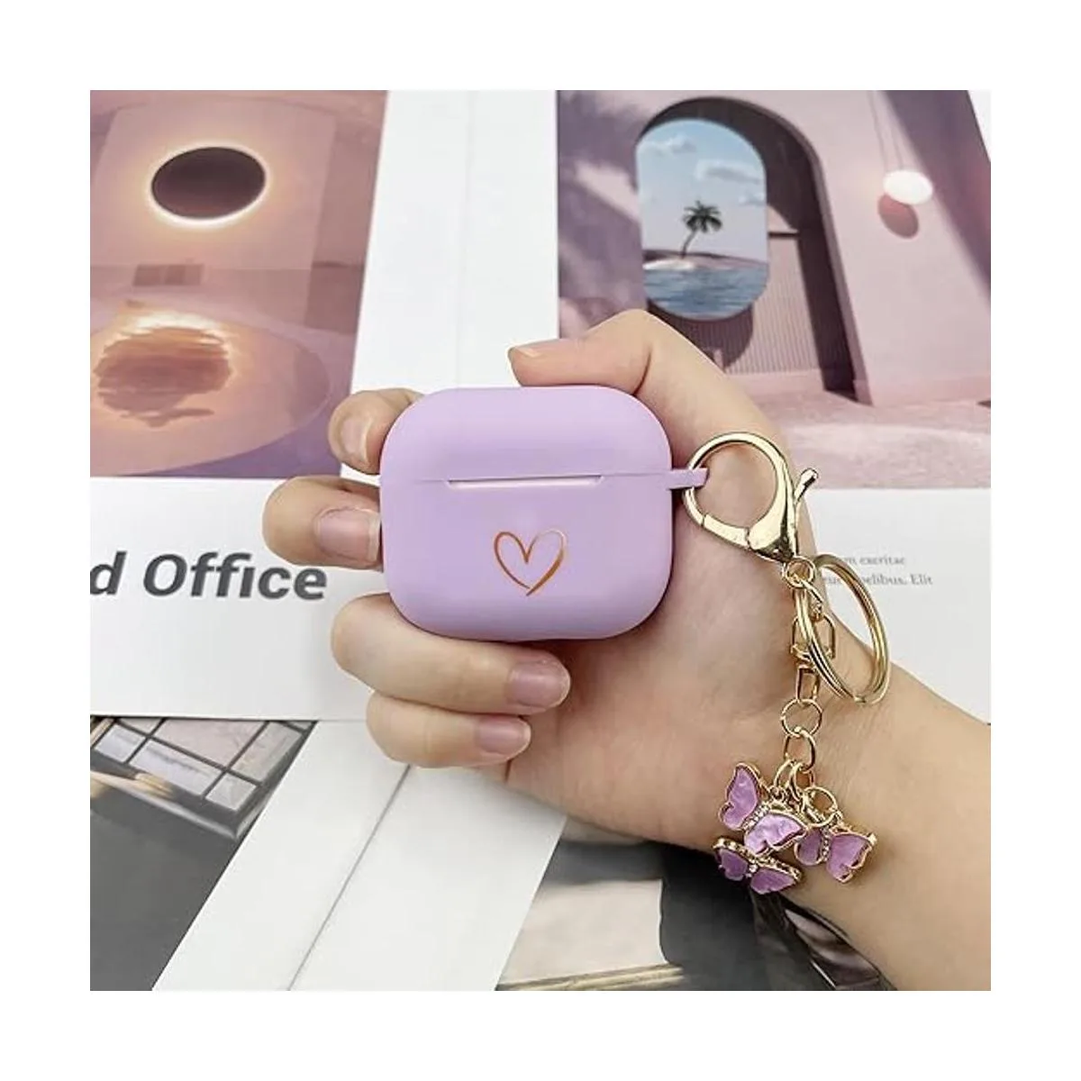 AIIEKZ Funda compatible con AirPods 3 2021, funda de silicona suave con patrón de corazón dorado para AirPods de tercera generación con bonito llavero de mariposa para niñas y mujeres morado