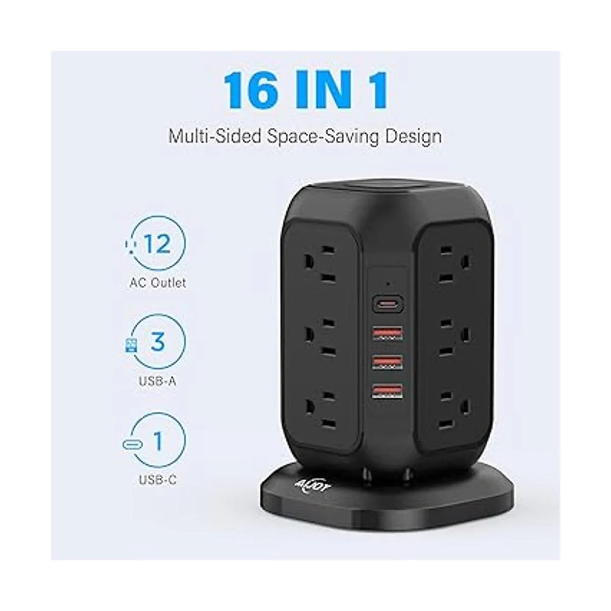 Tira de alimentación de torre 16 en 1: esta regleta de alimentación con USB C proporciona 12 enchufes de CA, 3 puertos USBA y 1 puerto USBC, enchufe en 4 lados, por lo que puedes conectar hasta 16 dispositivos al mismo tiempo. También puedes utilizar la tira de alimentación protectora de sobretensiones con USB en otro lugar porque el protector de sobretensiones de tira de alimentación soporta un amplio voltaje. No excedas la potencia nominal de 1250 W 125 V 2500 W 250 V.