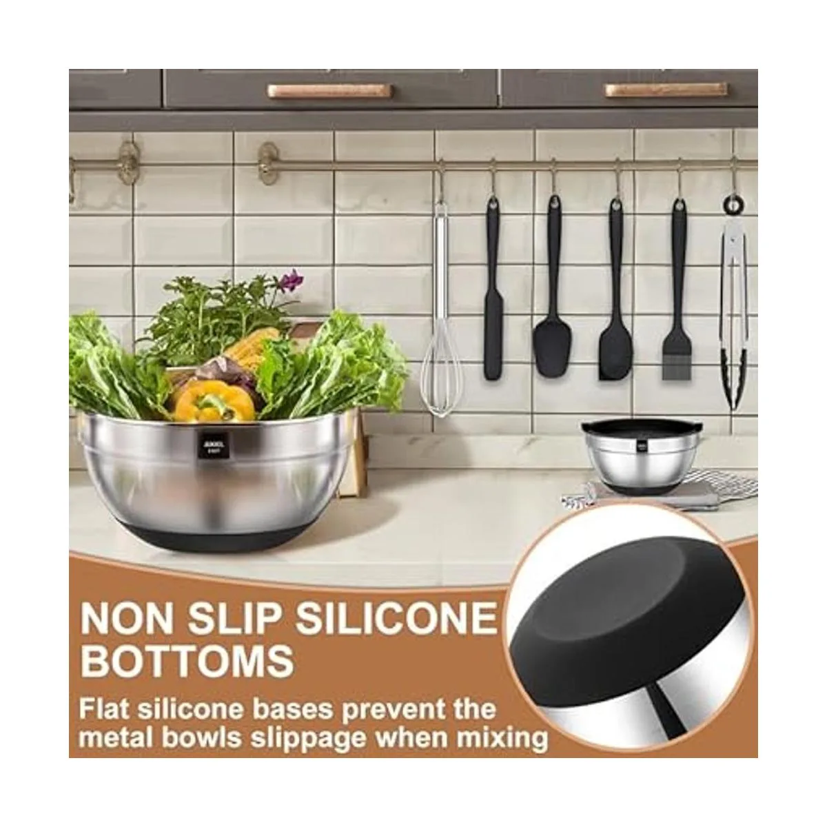 Parte inferior de silicona antideslizante: cada uno de los cuencos viene con parte inferior de silicona para evitar que el cuenco se mueva por la encimera mientras mezclas, amasas o batidas alimentos, puedes mezclar fácilmente todos tus ingredientes y alimentos favoritos y no tienes que preocuparte por que los cuencos se tambaleen al mezclar, golpear y batir