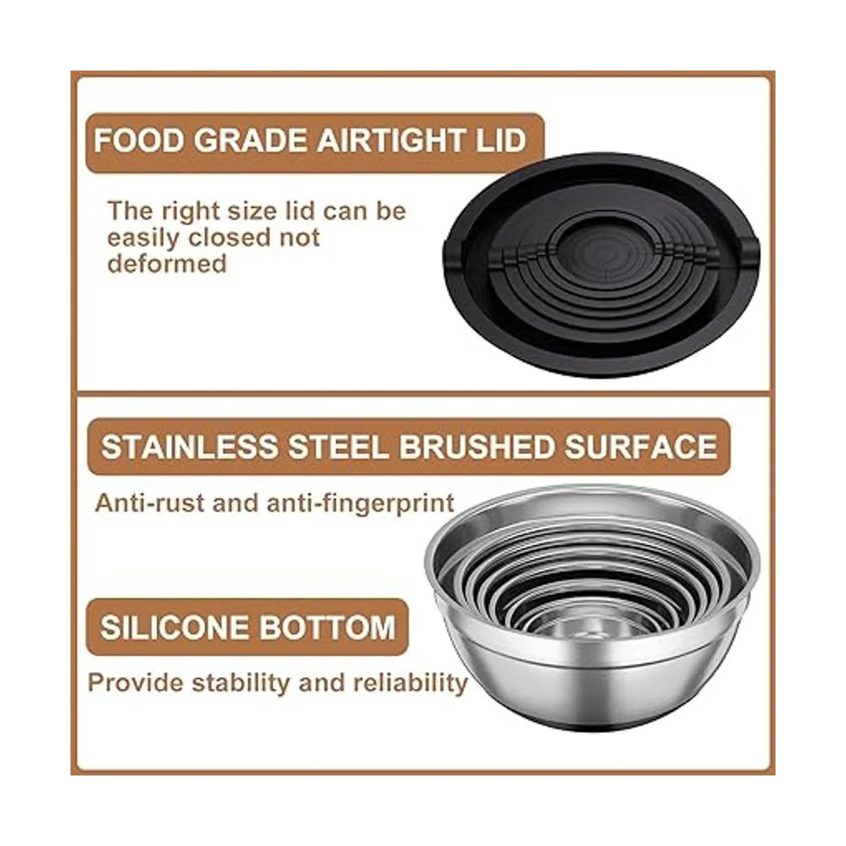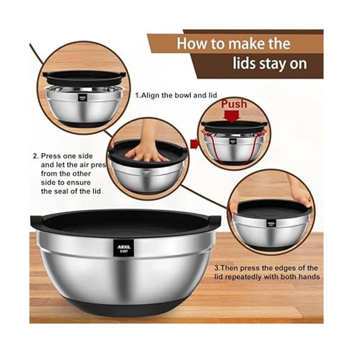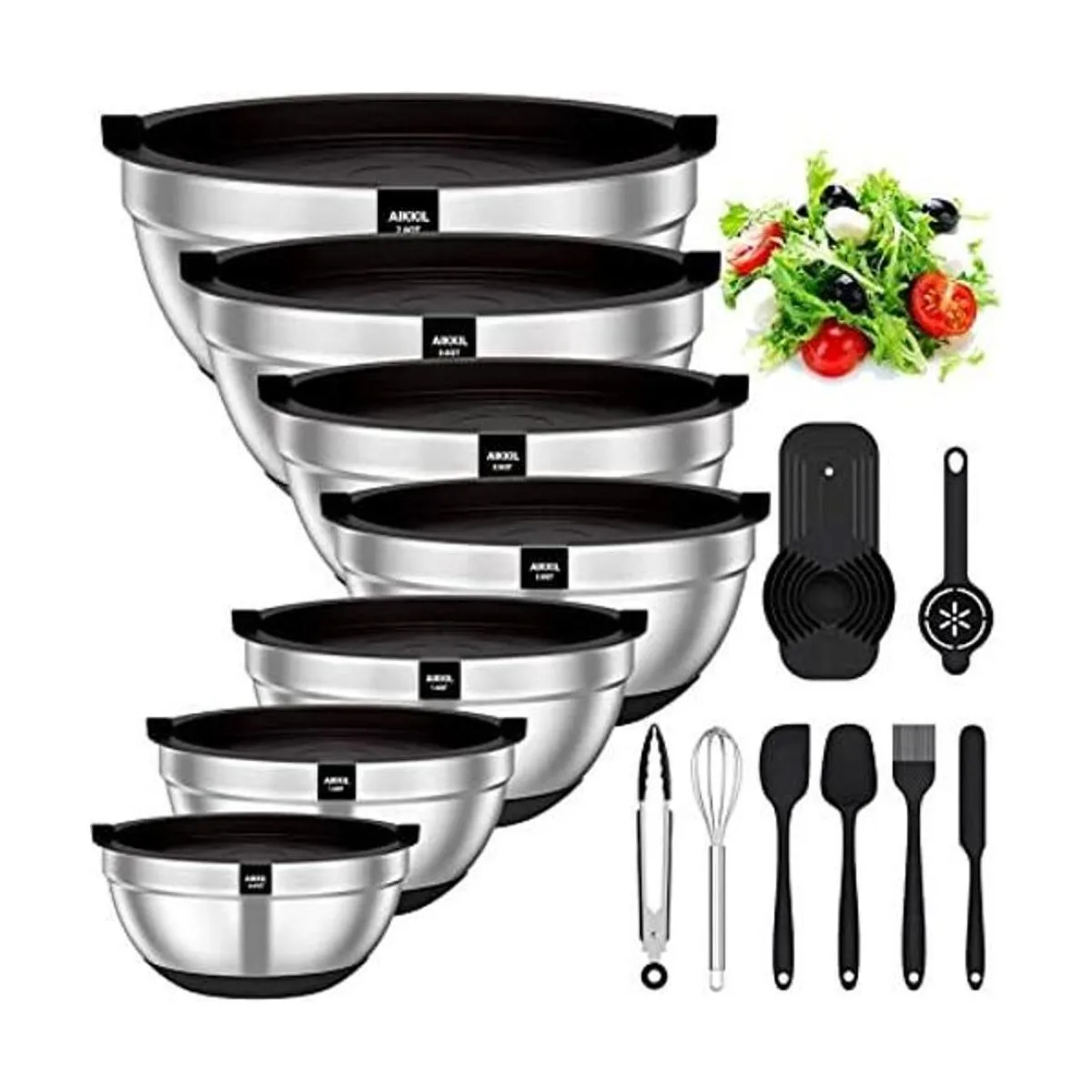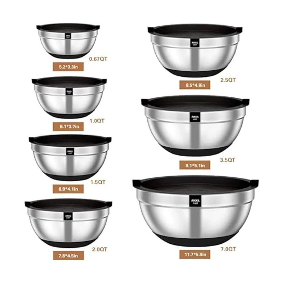 AIKKIL Cuencos para mezclar con tapas herméticas, 20 cuencos de acero inoxidable y metal, parte inferior de silicona antideslizante, tamaño 7, 3.5, 2.5, 2.0, 1.5, 1 y 0.67 cuartos de galón, ideal para mezclar, hornear, servir