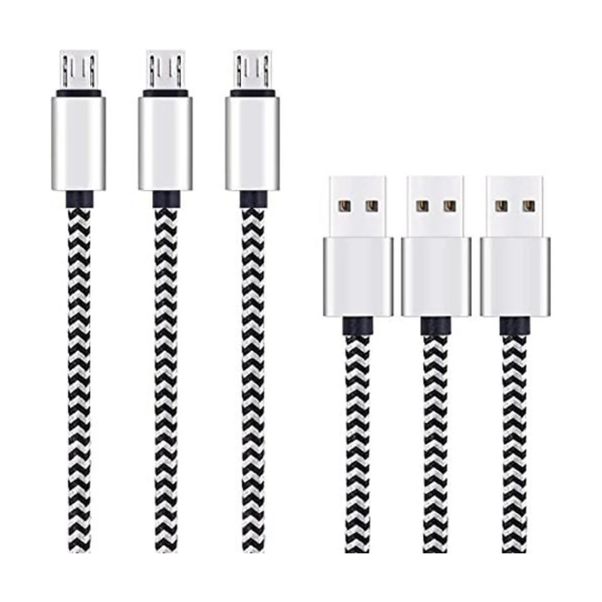 Ailun Cable micro USB de 10 pies, paquete de 3 unidades de alta velocidad 2.0 USB A macho a micro USB, cable trenzado de nailon para cargador de teléfono Android, tabletas, conexión de cargador de pared y cargador de automóvil, color plateado y blanco