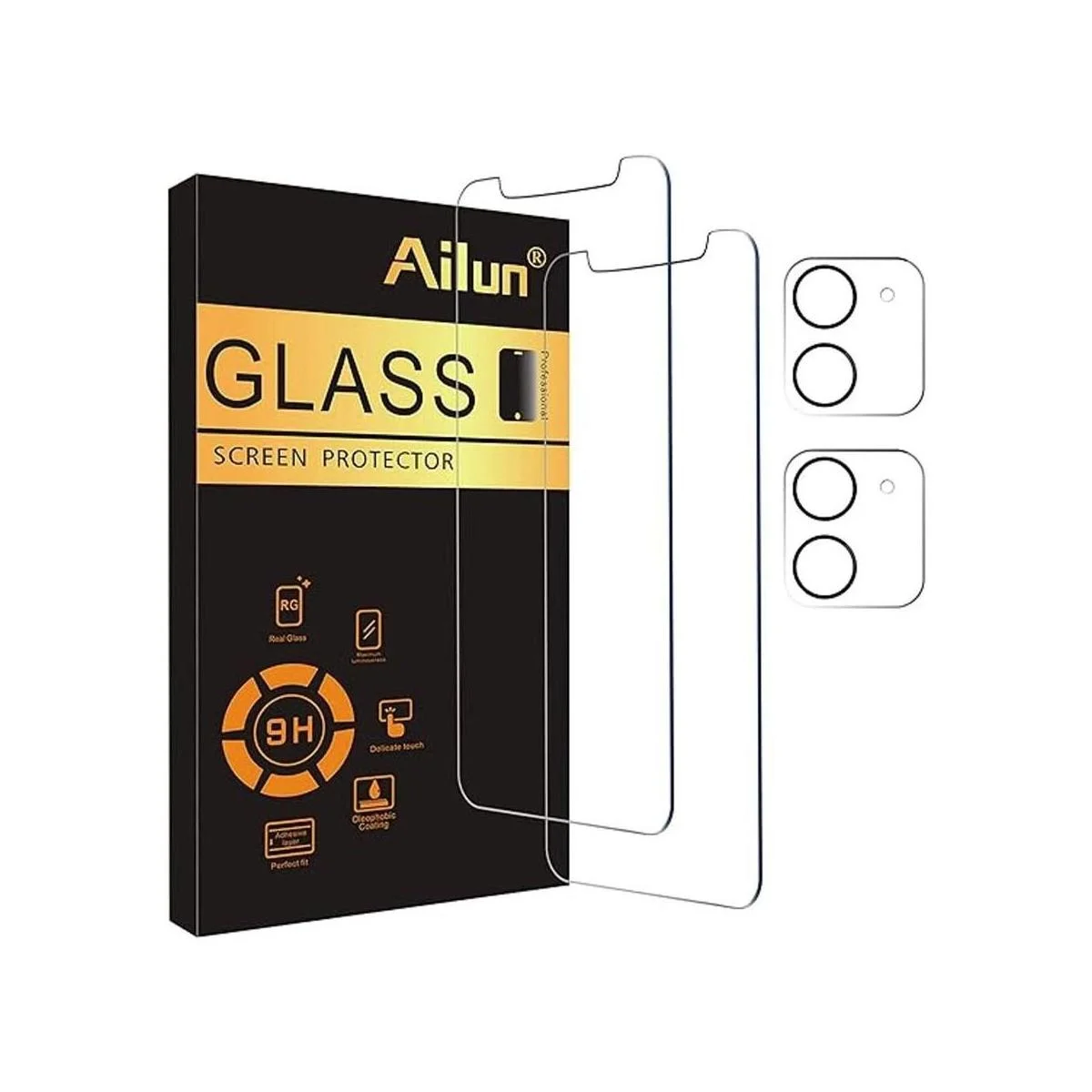 Ailun Paquete de 2 protectores de pantalla compatibles con iPhone 12 6.1 pulgadas paquete de 2 protectores de lente de cámara, película de vidrio templado, dureza 9H, HD