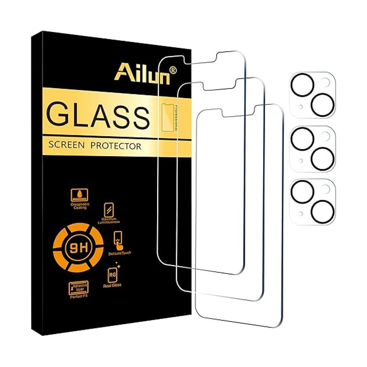 Ailun Paquete de 3 protectores de pantalla para iPhone 14 Plus 6.7 pulgadas 3 protectores de lente de cámara, película de vidrio templado compatible con fundas, dureza 9H, HD