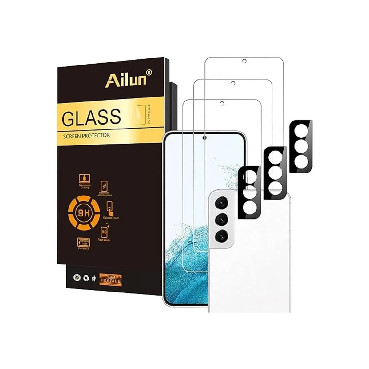Ailun Protector de pantalla de vidrio para Galaxy S22 5G pantalla de 6.1 pulgadas Paquete de 3 unidades 3 unidades de lente de cámara de vidrio templado, desbloqueo de huellas dactilares, compatible con funda transparente de 0.010 in no apto para S22 Ultra