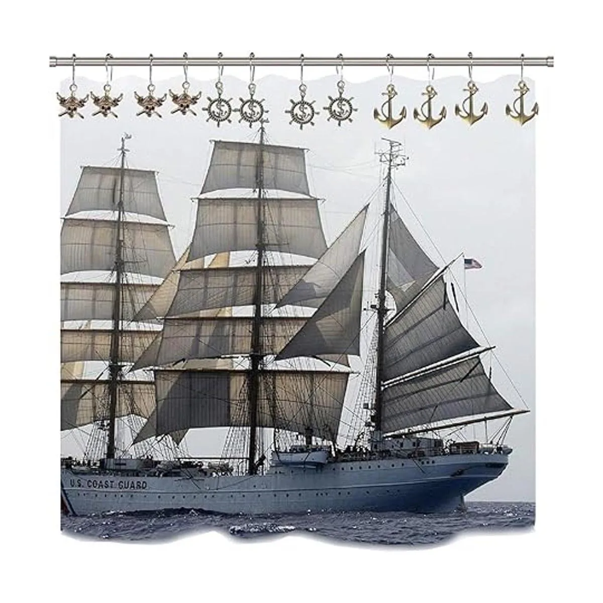 Aimoye Ganchos para cortina de ducha náuticos, anillos de calavera pirata, ancla, timón, juego de accesorios decorativos de baño, ganchos de metal plateado, para cortina de ventana, océano tropical, playa, decoración de baño con temática marina