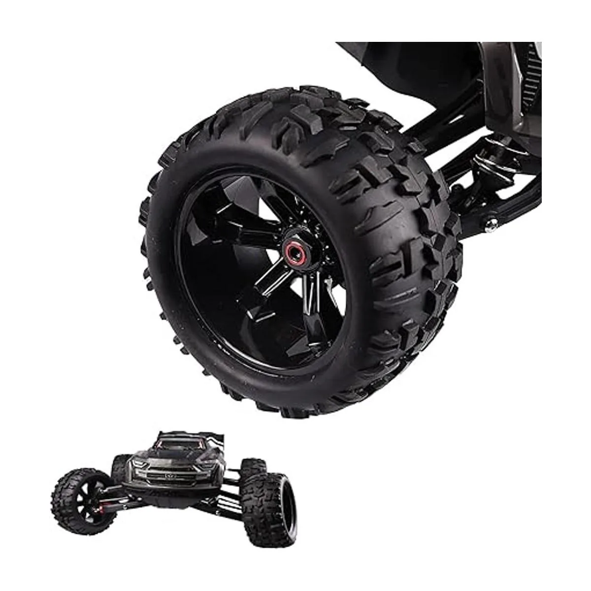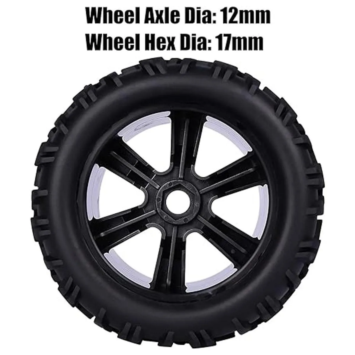 Características de los neumáticos: las lengetas únicas cumplen con tus requisitos extremos para todo terreno e increíble tracción en hierba, suciedad, barro y material suelto y mucho más. Hecho de goma calificada, resistencia al desgaste mejorada y rendimiento duradero. Características de la rueda: hecho de material de nailon de alta resistencia, más duradero para golpear. Inserto de espuma integral, mejor resistencia entre ruedas y neumáticos